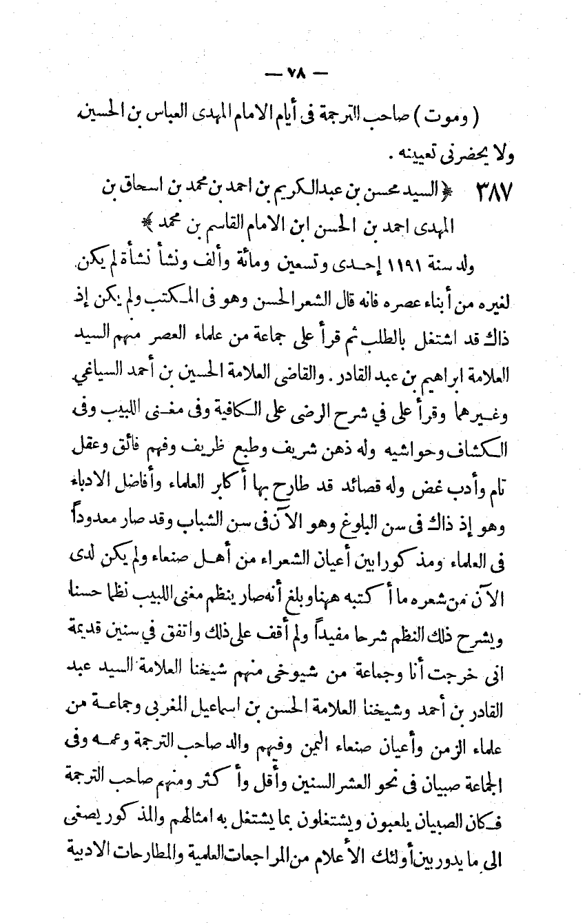 والقاضي الْعَلامَة الْحُسَيْن بن أَحْمد السياغي وَغَيرهمَا وَقَرَأَ علي فِي شرح الرضي على الكافية وفي مغنى اللبيب وفي الْكَشَّاف وحواشيه وَله ذهن شرِيف وطبع ظريف وَفهم فائق وعقل تَامّ وأدب غض وَله قصائد قد طارح بهَا أكَابِر الْعلمَاء وأفاضل الأدباء وَهُوَ إِذْ ذَاك في سن الْبلُوغ وَهُوَ الْآن في سن الشَّبَاب وَقد صَار معدودا في الْعلمَاء ومذكورا بَين أَعْيَان الشُّعَرَاء من أهل صنعاء وَلم يكن لَدَى الْآن من شعره مَا أكتبه هَهُنَا وَبلغ أَنه صَار ينظم مغني اللبيب نظما حسنا ويشرح ذَلِك النظم شرحا مُفِيدا وَلم أَقف على ذَلِك وَاتفقَ فِي سِنِين قديمَة أني خرجت أَنا وَجَمَاعَة من شيوخي مِنْهُم شَيخنَا الْعَلامَة السَّيِّد عبد الْقَادِر بن أَحْمد وَشَيخنَا الْعَلامَة الْحسن بن إِسْمَاعِيل المغربي وَجَمَاعَة من عُلَمَاء الزَّمن وأعيان صنعاء الْيمن وَفِيهِمْ وَالِد صَاحب التَّرْجَمَة وَعَمه وفي الْجَمَاعَة صبيان في نَحْو الْعشْر السنين وَأَقل وَأكْثر وَمِنْهُم صَاحب التَّرْجَمَة فَكَانَ الصبيان يَلْعَبُونَ ويشتغلون بِمَا يشْتَغل بِهِ أمثالهم وَالْمَذْكُور يصغي إِلَى مَا يَدُور بَين أُولَئِكَ الْأَعْلَام من المراجعات العلمية والمطارحات الأدبية