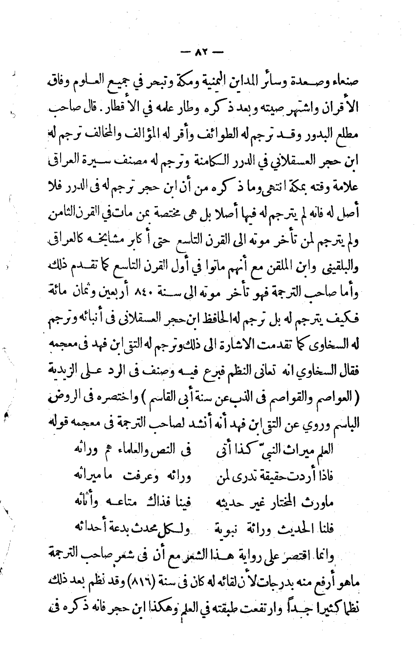 قَالَ صَاحب مطلع البدور وَقد ترْجم لَهُ الطوائف وَأقر لَهُ المؤالف والمخالف ترْجم لَهُ ابْن حجر الْعَسْقَلَانِي فِي الدُّرَر الكامنة وَترْجم لَهُ مُصَنف سيرة العراقي عَلامَة وقته بِمَكَّة انْتهى وَمَا ذكره من أَن ابْن حجر ترْجم لَهُ فى الدُّرَر فَلَا أصل لَهُ فَإِنَّهُ لم يترجم لَهُ فِيهَا أصلاً بل هي مُخْتَصَّة بِمن مَاتَ فِي الْقرن الثَّامِن وَلم يترجم لمن تَأَخّر مَوته إِلَى الْقرن التَّاسِع حَتَّى أكَابِر مشايخه كالعراقي والبلقيني وَابْن الملقن مَعَ أَنهم مَاتُوا فِي أول الْقرن التَّاسِع كَمَا تقدم ذَلِك وَأما صَاحب التَّرْجَمَة فَهُوَ تَأَخّر مَوته إِلَى سنة 840 أَرْبَعِينَ وثمان مائَة فَكيف يترجم لَهُ بل ترْجم لَهُ الْحَافِظ ابْن حجر العسقلاني فِي أنبائه وَترْجم لَهُ السخاوي كَمَا تقدمت الْإِشَارَة إِلَى ذَلِك وَترْجم لَهُ التقي ابْن فَهد فِي مُعْجَمه فَقَالَ السخاوي إنه تعاني النظم فبرع فِيهِ وصنف فِي الرَّد على الزيدية العواصم والقواصم فِي الذب عَن سنة أَبى الْقَاسِم وَاخْتَصَرَهُ فِي الرَّوْض الباسم وَرُوِيَ عَن التقي بن فَهد أَنه أنْشد لصَاحب التَّرْجَمَة فِي مُعْجَمه قَوْله