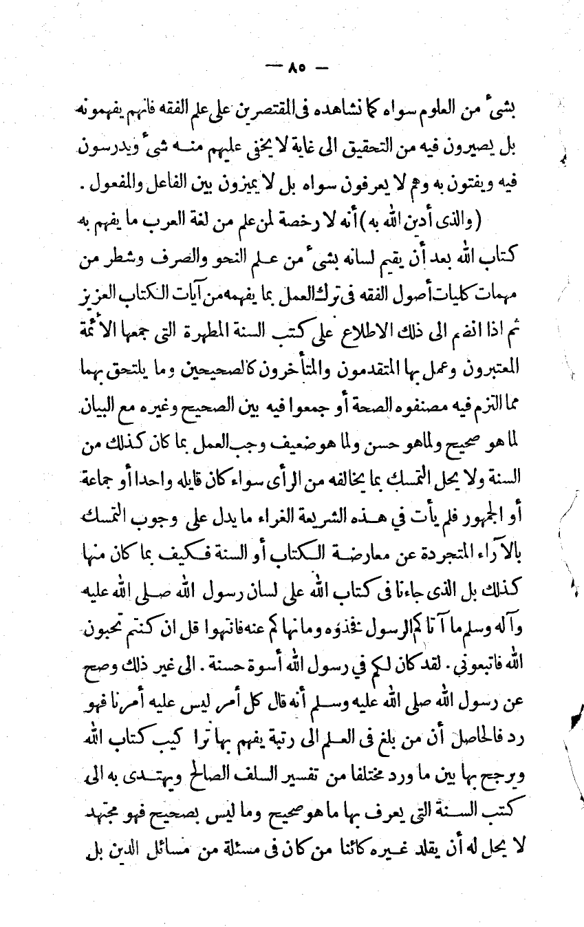 والذى أدين الله بِهِ أَنه لَا رخصَة لمن علم من لُغَة الْعَرَب مَا يفهم بِهِ كتاب الله بعد أَن يُقيم لِسَانه بشئ من علم النَّحْو وَالصرْف وَشطر من مهمات كليات أصُول الْفِقْه فِي ترك الْعَمَل بِمَا يفهمهُ من آيَات الْكتاب الْعَزِيز ثمَّ إِذا انْضَمَّ إِلَى ذَلِك الِاطِّلَاع على كتب السنة المطهرة الَّتِى جمعهَا الْأَئِمَّة المعتبرون وَعمل بهَا المتقدمون والمتأخرون كالصحيحين وَمَا يلْتَحق بهما مِمَّا الْتزم فِيهِ مصنفوه الصِّحَّة أَو جمعُوا فِيهِ بَين الصَّحِيح وَغَيره مَعَ الْبَيَان لما هُوَ صَحِيح وَلما هُوَ حسن وَلما هُوَ ضَعِيف وَجب الْعَمَل بِمَا كَانَ كَذَلِك من السنة وَلَا يحل التَّمَسُّك بِمَا يُخَالِفهُ من الرأي سَوَاء كَانَ قايله وَاحِدًا أَو جمَاعَة أَو الْجُمْهُور فَلم يَأْتِ فِي هَذِه الشَّرِيعَة الغراء مَا يدل على وجوب التَّمَسُّك بالآراء المتجردة عَن مُعَارضَة الْكتاب أَو السنة فَكيف بِمَا كَانَ مِنْهَا كَذَلِك بل الذي جَاءَنَا فِي كتاب الله على لِسَان رَسُول الله صلى الله عَلَيْهِ وَسلم مَا آتَاكُم الرَّسُول فَخُذُوهُ وَمَا نهاكم عَنهُ فَانْتَهوا قل إن كُنْتُم تحبون الله فَاتبعُوني لقد كَانَ لكم فِي رَسُول الله أُسْوَة حَسَنَة إلى غير ذَلِك وَصَحَّ عَن رَسُول الله صلى الله عَلَيْهِ وَسلم أَنه قَالَ كل أَمر لَيْسَ عَلَيْهِ أمرنَا فَهُوَ رد فَالْحَاصِل أَن من بلغ فِي الْعلم إِلَى رُتْبَة يفهم بهَا تراكيب كتاب الله ويرجح بهَا بَين مَا ورد مُخْتَلفا من تَفْسِير السّلف الصَّالح ويهتدى بِهِ إِلَى كتب السّنة الَّتِى يعرف بهَا مَا هُوَ صَحِيح وَمَا لَيْسَ بِصَحِيح فَهُوَ مُجْتَهد لَا يحل لَهُ أَن يُقَلّد غَيره كَائِنا من كَانَ فِي مسئلة من مسَائِل الدَّين بل