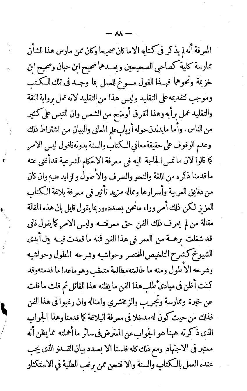 وَأما مَا يدندن حوله أَرْبَاب علم الْمعَانى وَالْبَيَان من اشْتِرَاط ذَلِك وَعدم الْوُقُوف على حَقِيقَة مَعَاني الْكتاب وَالسّنة بِدُونِهِ فَأَقُول لَيْسَ الْأَمر كَمَا قَالُوا لِأَن مَا تمس الْحَاجة إِلَيْهِ فِي معرفَة الْأَحْكَام الشَّرْعِيَّة قد أغْنى عَنهُ مَا قدمنَا ذكره من اللُّغَة والنحو الصّرْف وَالْأُصُول والزايد عَلَيْهِ وَإِن كَانَ من دقايق الْعَرَبيَّة وأسرارها ومماله مزِيد تَأْثِير فِي معرفَة بلاغة الْكتاب الْعَزِيز لَكِن ذَلِك أَمر وَرَاء مانحن بصدده وَرُبمَا يَقُول قايل بِأَن هَذِه الْمقَالة مقَالَة من لم يعرف ذَلِك الْفَنّ حق مَعْرفَته وَلَيْسَ الْأَمر كَمَا يَقُول فإنى قد شغلت بُرْهَة من الْعُمر فِي هَذَا الْفَنّ فَمِنْهُ مَا قعدت فِيهِ بَين أيدي الشُّيُوخ كشرح التَّلْخِيص الْمُخْتَصر وحواشيه وَشَرحه المطول وحواشيه وَشَرحه الأطول وَمِنْه مَا طالعته مطالعة متعقب وَهُوَ ماعدا مَا قَدمته وَقد كنت أَظن فِي مبادئ طلب هَذَا الْفَنّ مَا يَظُنّهُ هَذَا الْقَائِل ثمَّ قلت مَا قلت عَن خبْرَة وممارسة وتجريب والزمخشري وَأَمْثَاله وَإِن رَغِبُوا فِي هَذَا الْفَنّ فَذَلِك من حَيْثُ كَون لَهُ مدخلاً فِي معرفَة البلاغة كَمَا قدمنَا وَهَذَا الْجَواب الذي ذكرته هَهُنَا هُوَ الْجَواب عَن الْمُعْتَرض فِي سَائِر مَا أهملته مِمَّا يظن أَنه مُعْتَبر فِي الِاجْتِهَاد وَمَعَ ذَلِك كُله فلسنا إلا بصدد بَيَان الْقدر الذي يجب عِنْده الْعَمَل بِالْكتاب وَالسّنة وَإِلَّا فَنحْن مِمَّن يرغب الطّلبَة فِي الأستكثار