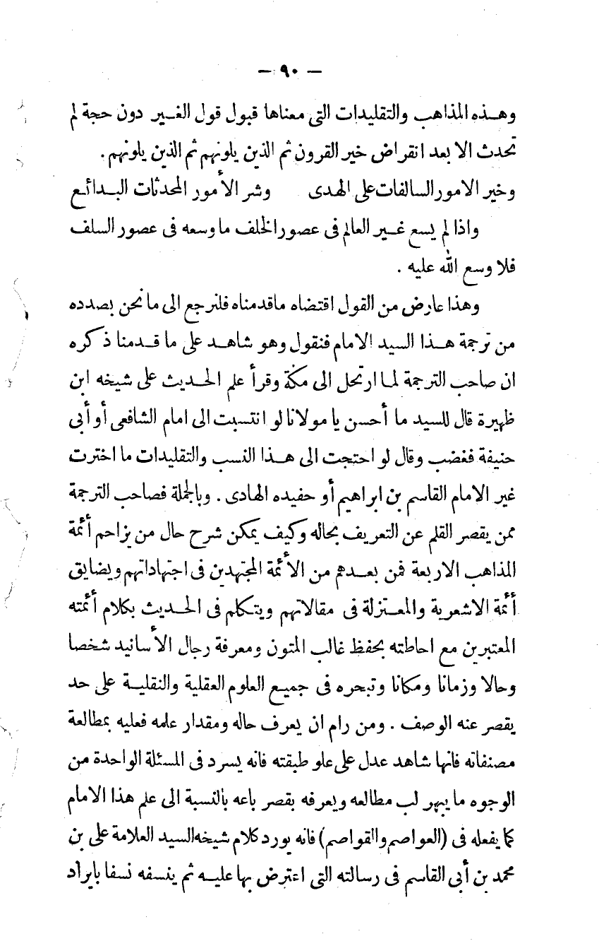 وَهَذَا عَارض من القَوْل اقْتَضَاهُ مَا قدمْنَاهُ فلنرجع إِلَى مَا نَحن بصدده من تَرْجَمَة هَذَا السَّيِّد الإِمَام فَنَقُول وَهُوَ شَاهد على مَا قدمنَا ذكره إن صَاحب التَّرْجَمَة لما ارتحل إِلَى مَكَّة وَقَرَأَ علم الحَدِيث على شَيْخه ابْن ظهيرة قَالَ للسَّيِّد مَا أحسن يَا مَوْلَانَا لَو انتسبت إِلَى إمام الشافعي أَو أَبى حنيفَة فَغَضب وَقَالَ لَو احتجت إِلَى هَذَا النّسَب والتقليدات مَا اخْتَرْت غير الإِمَام الْقَاسِم بن إِبْرَاهِيم أَو حفيده الهادي