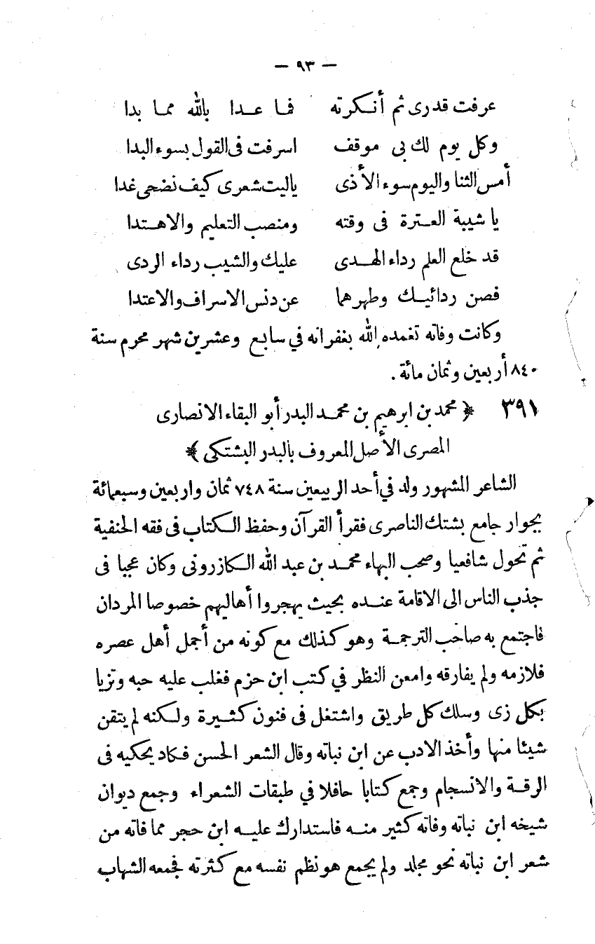 الشَّاعِر الْمَشْهُور ولد فِي أحد الربيعين سنة 748 ثَمَان وَأَرْبَعين وَسَبْعمائة بجوار جَامع بشتك الناصري فَقَرَأَ الْقُرْآن وَحفظ الْكتاب فِي فقه الْحَنَفِيَّة ثمَّ تحول شافعيا وَصَحب الْبَهَاء مُحَمَّد بن عبد الله الكازروني وَكَانَ عجبا فِي جذب النَّاس إِلَى الْإِقَامَة عِنْده بِحَيْثُ يهجروا أَهَالِيهمْ خُصُوصا المردان فَاجْتمع بِهِ صَاحب التَّرْجَمَة وَهُوَ كَذَلِك مَعَ كَونه من أجمل أهل عصره فلازمه وَلم يُفَارِقهُ وأمعن النظر فِي كتب ابْن حزم فغلب عَلَيْهِ حبه وتزيا بِكُل زي وسلك كل طَرِيق واشتغل فِي فنون كَثِيرَة وَلكنه لم يتقن شَيْئا مِنْهَا وَأخذ الْأَدَب عَن ابْن نَبَاته وَقَالَ الشّعْر الْحسن فكاد يحكيه فِي الرقة والانسجام وَجمع كتابا حافلا فِي طَبَقَات الشُّعَرَاء وَجمع ديوَان شَيْخه ابْن نَبَاته وَفَاته كثير مِنْهُ فاستدارك عَلَيْهِ ابْن حجر مِمَّا فَاتَهُ من شعر ابْن نَبَاته نَحْو مُجَلد وَلم يجمع هُوَ نظم نَفسه مَعَ كثرته فَجَمعه الشهَاب