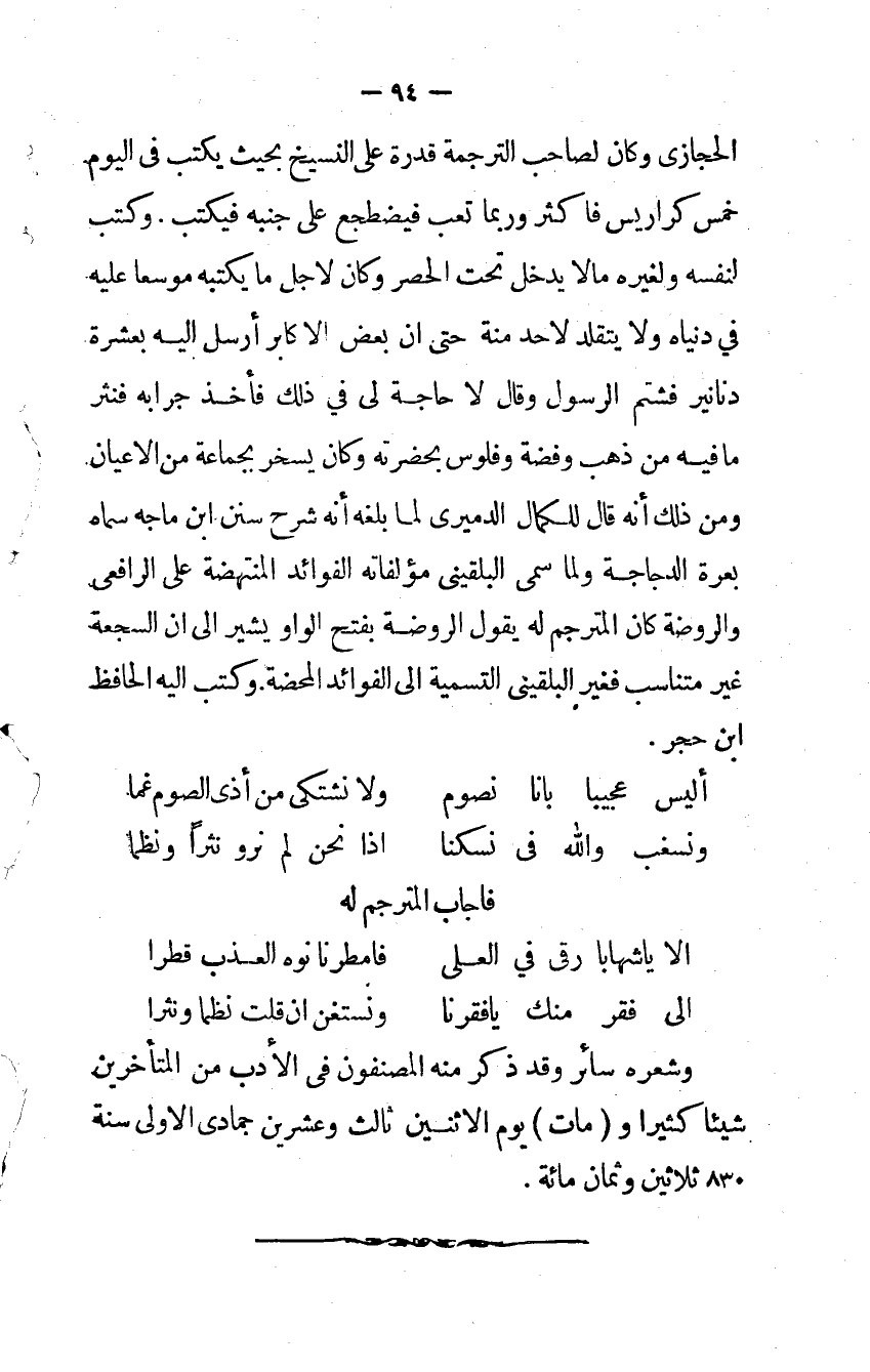 الحجازي وَكَانَ لصَاحب التَّرْجَمَة قدرَة على النسيخ بِحَيْثُ يكْتب فِي الْيَوْم خمس كراريس فَأكْثر وَرُبمَا تَعب فيضطجع على جنبه فَيكْتب