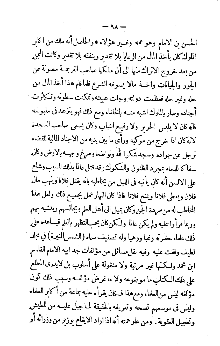 الْحسن بن الإِمَام وَهُوَ عَمه وَغير هَؤُلَاءِ وَالْحَاصِل أَنه ملك من أكابر الْمُلُوك كَانَ يَأْخُذ المَال من الرعايا بِلَا تَقْدِير وينفقه بِلَا تَقْدِير وَكَانَت الْيمن من بعد خُرُوج الأتراك مِنْهَا إِلَى أَن ملكهَا صَاحب التَّرْجَمَة مصونة عَن الْجور والجبانات وَأخذ مَالا يسوغه الشَّرْع فَلَمَّا قَامَ هَذَا أَخذ المَال من حله وَغير حله فعظمت دولته وجلت هيبته وتمكنت سطوته وتكاثرت أجناده وَصَارَ بالملوك أشبه مِنْهُ بالخلفاء وَمَعَ ذَلِك فَهُوَ يتزهد فِي ملبوسه فَإِنَّهُ كَانَ لَا يلبس الْحَرِير وَلَا رفيع الثِّيَاب وَكَانَ يُسمى صَاحب السَّجْدَة لِأَنَّهُ كَانَ إِذا خرج من موكبه وَرَأى مَا بَين يَدَيْهِ من الأجناد الْمَالِيَّة للْقَضَاء ترجل عَن جَوَاده وَسجد شكرا لله وتواضعا ومرغ وَجهه بِالْأَرْضِ وَكَانَ سفاكا للدماء بِمُجَرَّد الظنون والشكوك وَقد قتل عَالما بذلك السَّبَب وشاع على الألسن أَنه كَانَ يَأْتِيهِ فِي اللَّيْل من يخاطبه بِأَنَّهُ يقتل فلَانا وينهب مَال فلَان وَيُعْطى فلَانا وَيمْنَع فلَانا فَإِذا كَانَ النَّهَار عمل بِجَمِيعِ ذَلِك وَلَعَلَّ هَذَا الْمُخَاطب لَهُ من مَرَدَة الْجِنّ وَكَانَ يمِيل إِلَى أهل الْعلم ويجالسهم ويتشبه بهم وَرُبمَا قرأوا عَلَيْهِ وَلم يكن عَالما وَلَكِن كَانَ يحب التظهر بِالْعلمِ فيساعده على ذَلِك عُلَمَاء حَضرته رغبا ورهبا وَله تصنيف سَمَّاهُ الشَّمْس المنيرة فِي مُجَلد لطيف وقفت عَلَيْهِ وَفِيه نقل مسَائِل من مؤلفات جد ابيه الإِمَام الْقَاسِم ابْن مُحَمَّد وَلكنهَا غير مرتبَة وَلَا منقولة على أسلوب بل لَا يدري المطلع على ذَلِك الْكتاب مَا مَوْضُوعه وَلَا مَا غَرَض مُؤَلفه وَسبب ذَلِك كَون مُؤَلفه لَيْسَ من الْعلمَاء وَمَعَ هَذَا فَكَانَ يقرأه عَلَيْهِ جمَاعَة من أكَابِر الْعلمَاء وَلَيْسَ فِي موسعهم نصحه وتعريفه بِالْحَقِيقَةِ لما جبل عَلَيْهِ من الطيش وتعجيل الْعقُوبَة