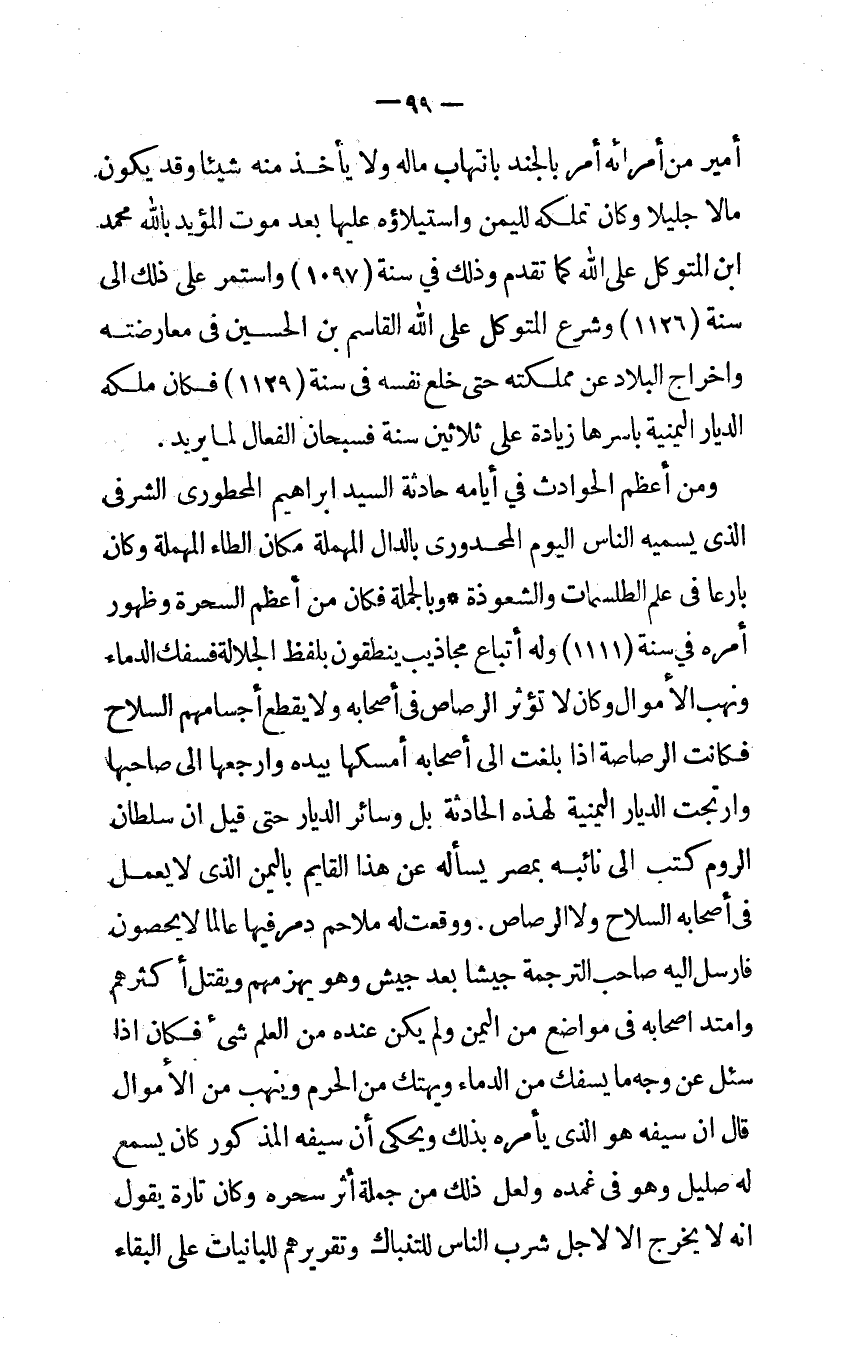 أَمِير من أمرائه أَمر بالجند بانتهاب مَاله وَلَا يَأْخُذ مِنْهُ شَيْئا وَقد يكون مَالا جَلِيلًا وَكَانَ تملكه لليمن واستيلاؤه عَلَيْهَا بعد موت الْمُؤَيد بِاللَّه مُحَمَّد ابْن المتَوَكل على الله كَمَا تقدم وَذَلِكَ فِي سنة 1097 وَاسْتمرّ على ذَلِك إِلَى سنة 1126 وَشرع المتَوَكل على الله الْقَاسِم بن الْحُسَيْن فِي معارضته وَإِخْرَاج الْبِلَاد عَن مَمْلَكَته حَتَّى خلع نَفسه فِي سنة 1129 فَكَانَ ملكه الديار اليمنية بأسرها زِيَادَة على ثَلَاثِينَ سنة فسبحان الفعال لما يُرِيد