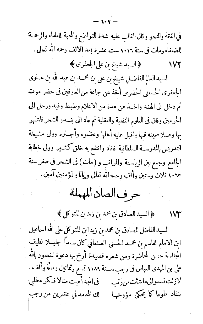 السَّيِّد الْفَاضِل الصَّادِق بن مُحَمَّد بن زيد ابْن المتَوَكل على الله إِسْمَاعِيل ابْن الإِمَام الْقَاسِم بن مُحَمَّد الْحسنى الصنعانى كَانَ سيدا جَلِيلًا لطيف المجالسة حسن المحاضرة وَمن شعره قصيدة أرخ بهَا دَعْوَة الْمَنْصُور بِاللَّه على بن المهدى الْعَبَّاس فِي رَجَب سنة 1189 تسع وَثَمَانِينَ وَمِائَة وَألف