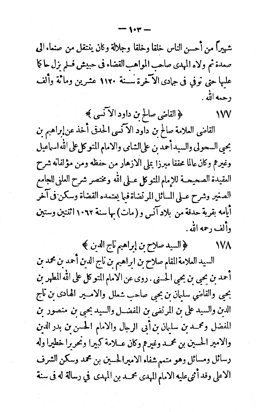شهيرا من أحسن النَّاس خلقا وخلقا وجلالة وَكَانَ ينْتَقل من صنعاء إِلَى صعدة ثمَّ ولاه المهدى صَاحب الْمَوَاهِب الْقَضَاء فِي حُبَيْش فَلم يزل حَاكما عَلَيْهَا حَتَّى توفى فِي جُمَادَى الْآخِرَة سنة 1120 عشْرين وَمِائَة وَألف رَحمَه الله