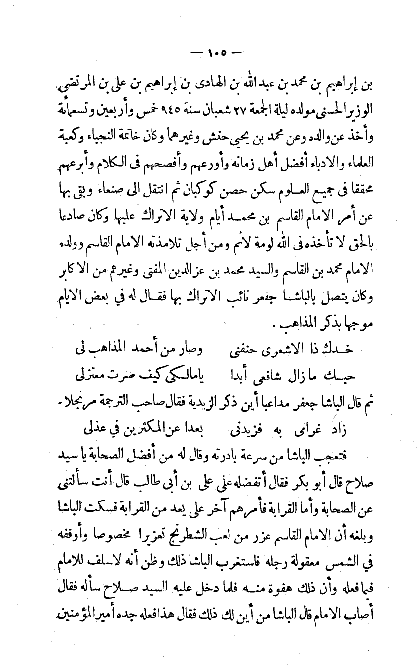 ثمَّ قَالَ الباشا جَعْفَر مداعبا أَيْن ذكر الزيدية فَقَالَ صَاحب التَّرْجَمَة مرتجلا