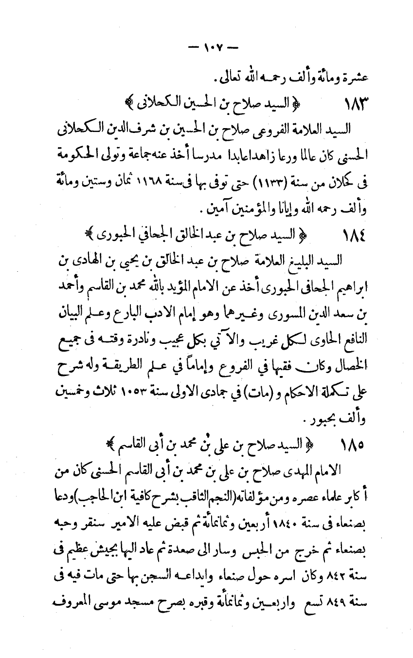 السَّيِّد الْعَلامَة الفروعى صَلَاح بن الْحُسَيْن بن شرف الدّين الكحلانى الْحسنى كَانَ عَالما ورعا زاهدا عابدا مدرسا أَخذ عَنهُ جمَاعَة وَتَوَلَّى الْحُكُومَة فِي كحلان من سنة 1133 حَتَّى توفى بهَا فِي سنة 1168 ثَمَان وَسِتِّينَ وَمِائَة وَألف رَحمَه الله وإيانا وَالْمُؤمنِينَ آمين