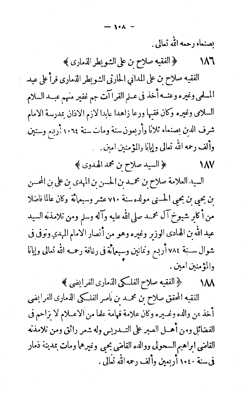 الْفَقِيه صَلَاح بن على المداني الحارثى الشويطر الذمارى قَرَأَ على عبد المسلمى وَغَيره وَعنهُ أَخذ فِي علم القراآت جم غفير مِنْهُم عبد السَّلَام السلامى وَغَيره وَكَانَ فَقِيها ورعا زاهدا عابدا لَازم الْأَذَان بمدرسة الإِمَام شرف الدّين بِصَنْعَاء ثَلَاثًا وَأَرْبَعُونَ سنة وَمَات سنة 1064 أَربع وَسِتِّينَ وَألف رَحمَه الله تَعَالَى وإيانا وَالْمُؤمنِينَ آمين