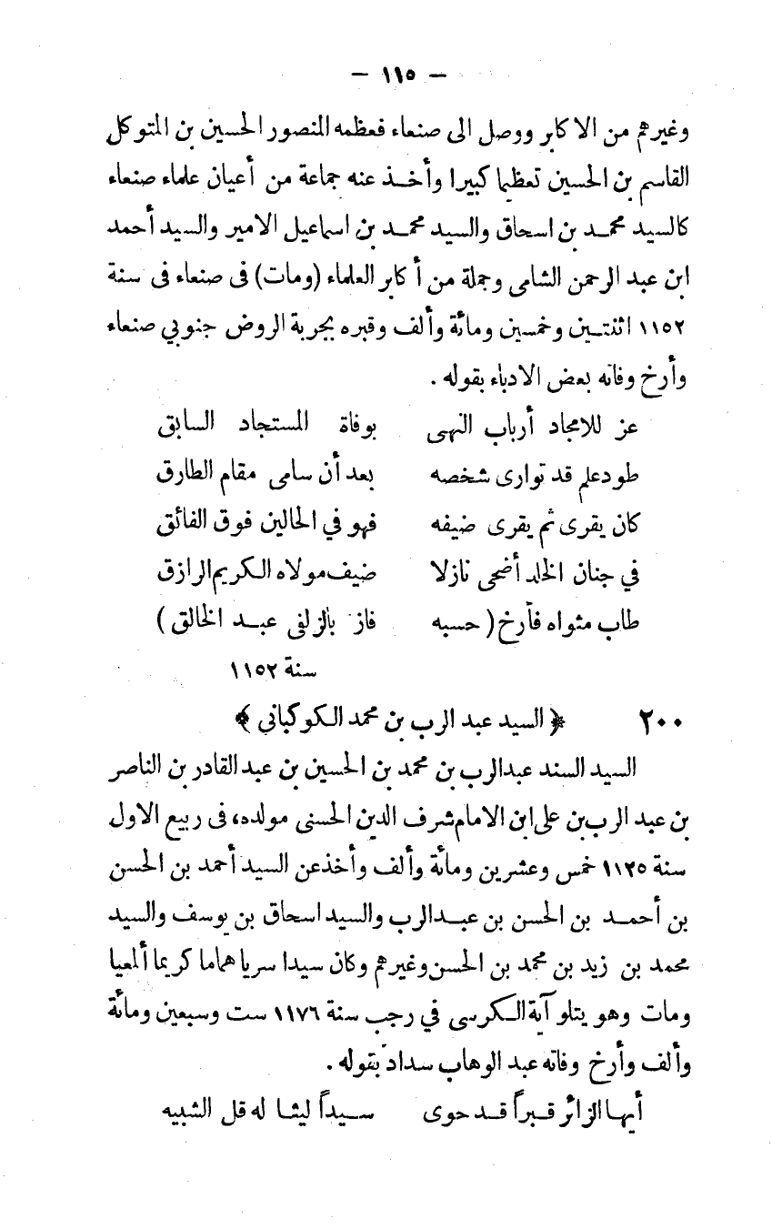 وَغَيرهم من الأكابر وَوصل إِلَى صنعاء فَعَظمهُ الْمَنْصُور الْحُسَيْن بن المتَوَكل الْقَاسِم بن الْحُسَيْن تَعْظِيمًا كَبِيرا وَأخذ عَنهُ جمَاعَة من أَعْيَان عُلَمَاء صنعاء كالسيد مُحَمَّد بن اسحاق وَالسَّيِّد مُحَمَّد بن إِسْمَاعِيل الْأَمِير وَالسَّيِّد احْمَد ابْن عبد الرَّحْمَن الشامى وَجُمْلَة من أكَابِر الْعلمَاء وَمَات فِي صنعاء فِي سنة 1152 اثْنَتَيْنِ وَخمسين وَمِائَة وَألف وقبره بجربة الرَّوْض جنوبى صنعاء وأرخ وَفَاته بعض الأدباء بقوله