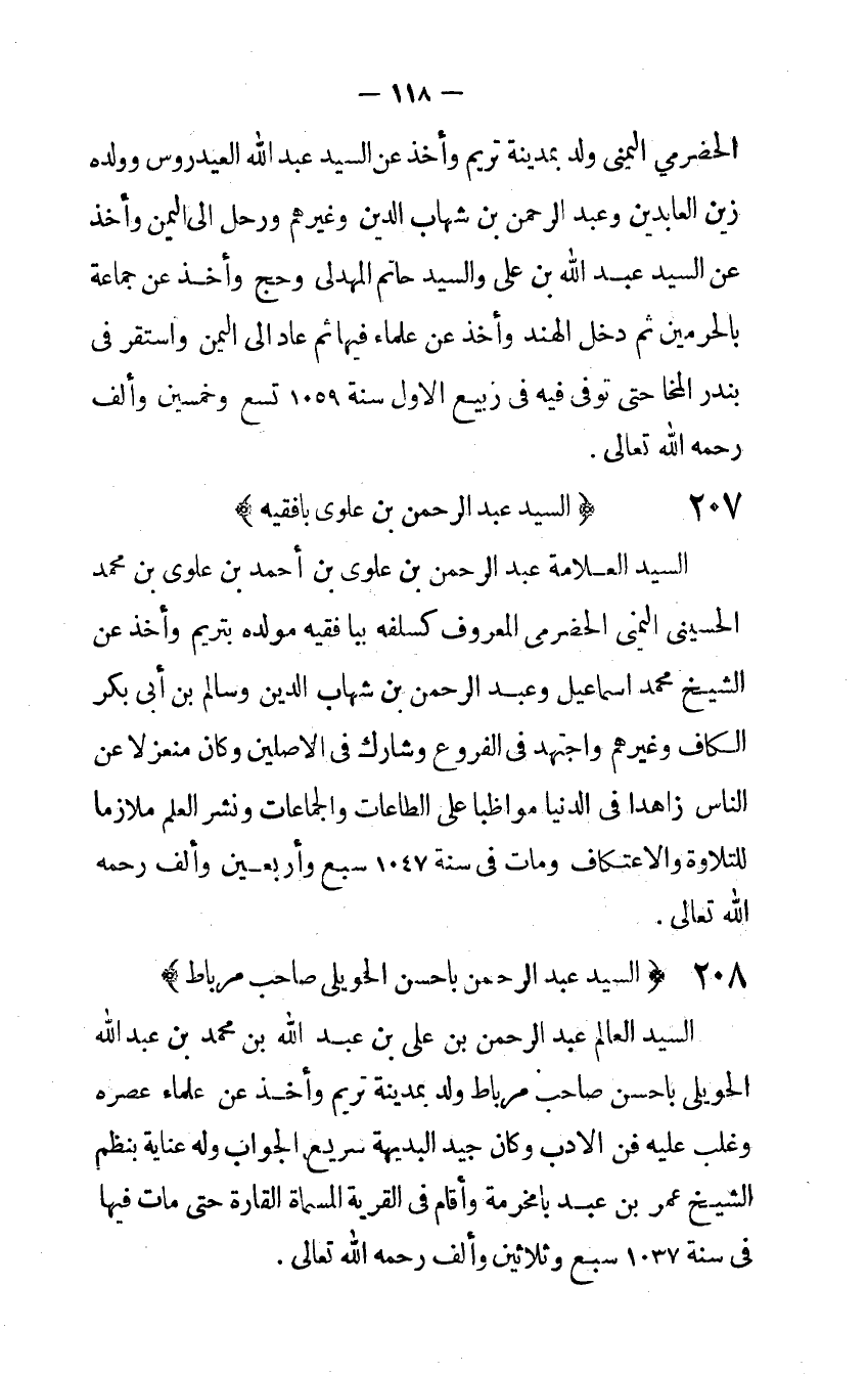 السَّيِّد الْعَلامَة عبد الرَّحْمَن بن علوى بن أَحْمد بن علوى بن مُحَمَّد الحسينى الْيُمْنَى الحضرمى الْمَعْرُوف كسلفه ببافقيه مولده بتريم وَأخذ عَن الشَّيْخ مُحَمَّد إِسْمَاعِيل وَعبد الرَّحْمَن بن شهَاب الدّين وَسَالم بن أَبى بكر الْكَاف وَغَيرهم واجتهد فِي الْفُرُوع وشارك فِي الْأَصْلَيْنِ وَكَانَ منعزلا عَن النَّاس زاهدا فِي الدُّنْيَا مواظبا على الطَّاعَات وَالْجَمَاعَات وَنشر الْعلم ملازما للتلاوة وَالِاعْتِكَاف وَمَات فِي سنة 1047 سبع وَأَرْبَعين وَألف رَحمَه الله تَعَالَى