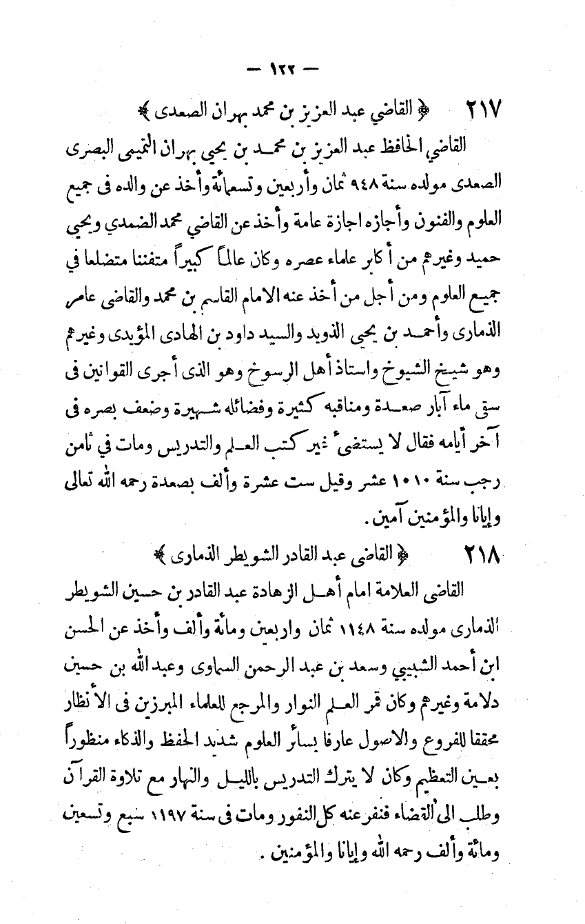القاضى الْعَلامَة امام أهل الزهادة عبد الْقَادِر بن حُسَيْن الشويطر الذمارى مولده سنة 1148 ثَمَان وَأَرْبَعين وَمِائَة وَألف وَأخذ عَن الْحسن ابْن أَحْمد الشبيبي وَسعد بن عبد الرَّحْمَن السماوى وَعبد الله بن حُسَيْن دلامة وَغَيرهم وَكَانَ قمر الْعلم النوار والمرجع للْعُلَمَاء المبرزين فِي الأنظار محققا للفروع وَالْأُصُول عَارِفًا بِسَائِر الْعُلُوم شَدِيد الْحِفْظ والذكاء منظورا بِعَين التَّعْظِيم وَكَانَ لَا يتْرك التدريس بِاللَّيْلِ وَالنَّهَار مَعَ تِلَاوَة الْقُرْآن وَطلب إِلَى الْقَضَاء فنفر عَنهُ كل النفور وَمَات فِي سنة 1197 سبع وَتِسْعين وَمِائَة وَألف رَحمَه الله وإيانا وَالْمُؤمنِينَ آمين