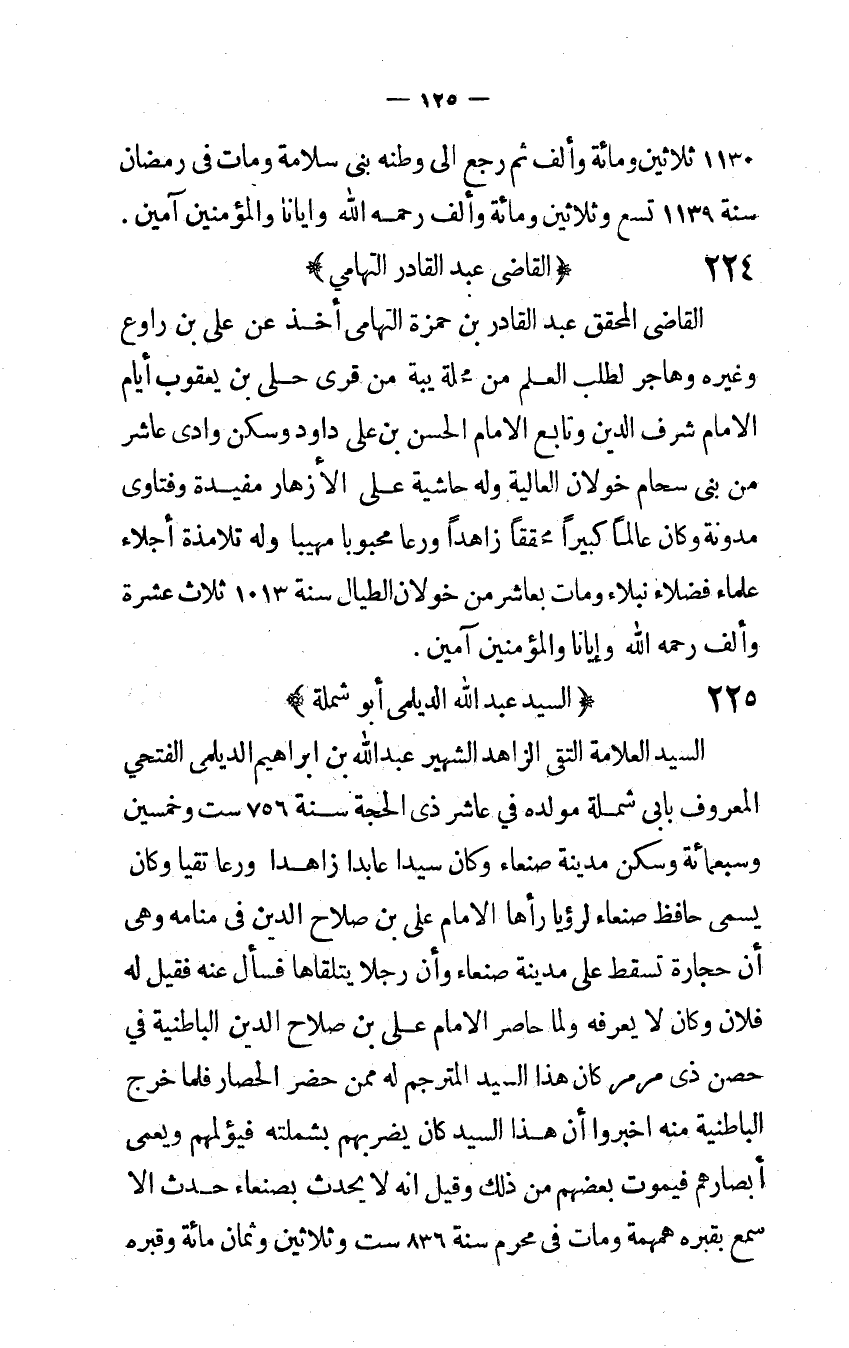 القاضى الْمُحَقق عبد الْقَادِر بن حَمْزَة التهامى أَخذ عَن على بن راوع وَغَيره وَهَاجَر لطلب الْعلم من محلّة يبة من قرى حلى بن يَعْقُوب أَيَّام الإِمَام شرف الدّين وتابع الإِمَام الْحسن بن على دَاوُد وَسكن وادى عَاشر من بنى سحام خولان الْعَالِيَة وَله حَاشِيَة على الأزهار مفيدة وفتاوى مدونة وَكَانَ عَالما كَبِيرا محققا زاهدا ورعا محبوبا مهيبا وَله تلامذة أجلاء عُلَمَاء فضلاء نبلاء وَمَات بعاشر من خولان الطيال سنة 1013 ثَلَاث عشرَة وَألف رَحمَه الله وإيانا وَالْمُؤمنِينَ آمين