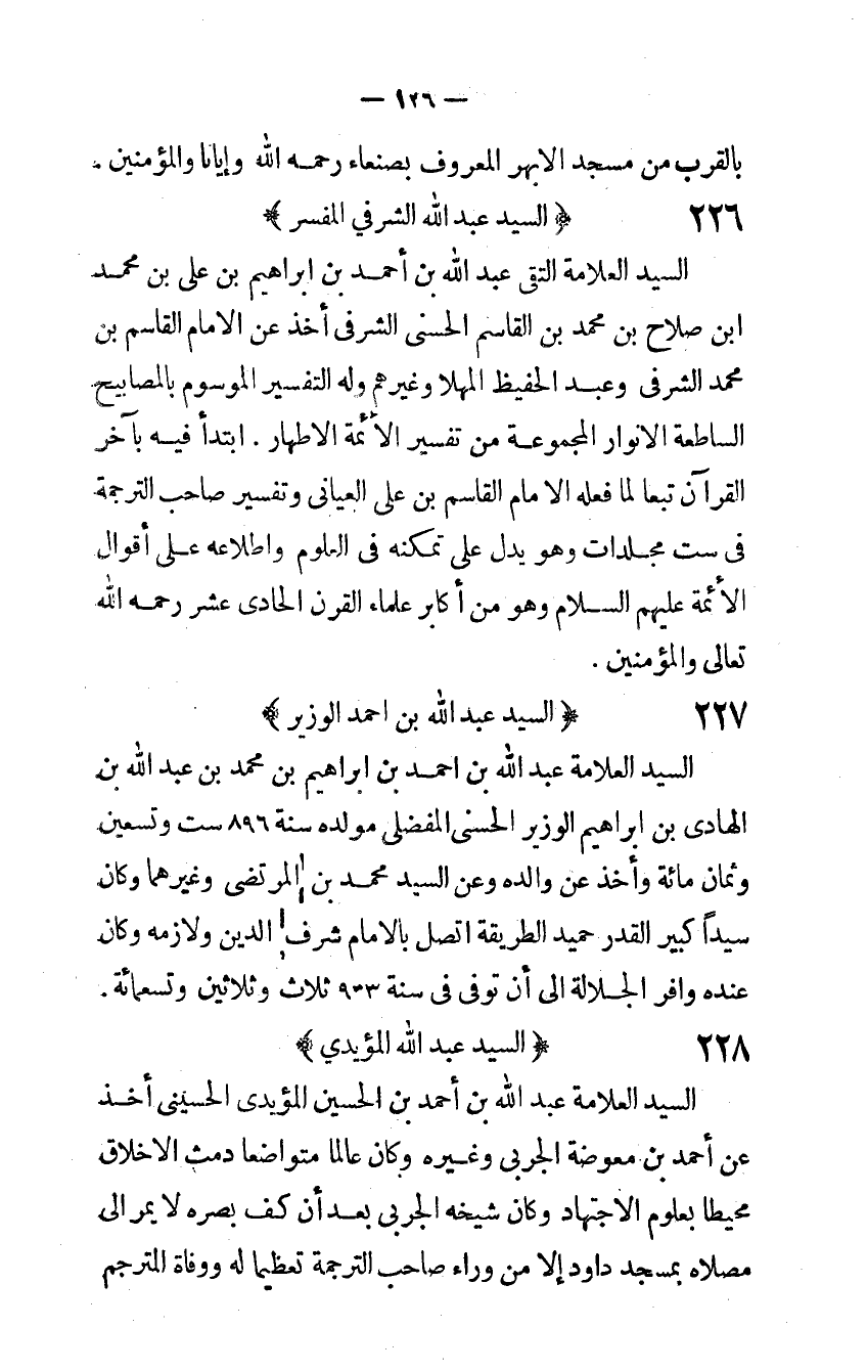السَّيِّد الْعَلامَة عبد الله بن احْمَد بن إِبْرَاهِيم بن مُحَمَّد بن عبد الله بن الهادى بن إِبْرَاهِيم الْوَزير الْحسنى المفضلى مولده سنة 896 سِتّ وَتِسْعين وثمان مائَة وَأخذ عَن وَالِده وَعَن السَّيِّد مُحَمَّد بن المرتضى وَغَيرهمَا وَكَانَ سيدا كَبِير الْقدر حميد الطَّرِيقَة اتَّصل بِالْإِمَامِ شرف الدّين ولازمه وَكَانَ عِنْده وافر الْجَلالَة إِلَى أَن توفى فِي سنة 933 ثَلَاث وَثَلَاثِينَ وَتِسْعمِائَة