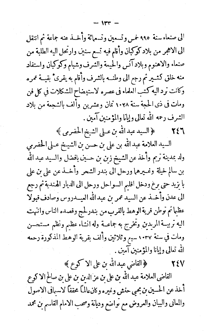 السَّيِّد الْعَلامَة عبد الله بن على بن حسن بن الشَّيْخ على الحضرمى ولد بِمَدِينَة تريم وَأخذ عَن الشَّيْخ زين بن حُسَيْن بَافضل وَالسَّيِّد عبد الله بن سَالم خيلة وَغَيرهمَا ورحل إِلَى بندر الشحر وَأخذ عَن على بن على بايزيد حَتَّى برع وَدخل اقليم السواحل ورحل إِلَى الديار الْهِنْدِيَّة ثمَّ رَجَعَ إِلَى عدن وَأخذ عَن السَّيِّد عمر بن عبد الله العيدروس وصادف قبولا عَظِيما ثمَّ توطن قَرْيَة الوهط بِالْقربِ من بندر لحج وقصده النَّاس وانتهت إِلَيْهِ تربية المريدين وَتخرج بِهِ جمَاعَة وَله انشاء عَظِيم ونظم مستحسن وَمَات فِي سنة 1037 سبع وَثَلَاثِينَ وَألف بقرية الوهط الْمَذْكُورَة رَحمَه الله تَعَالَى وإيانا وَالْمُؤمنِينَ آمين