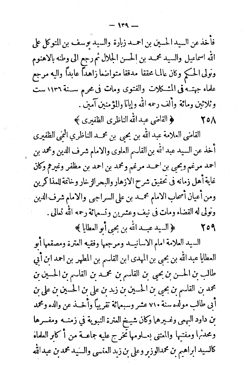 السَّيِّد الْعَلامَة امام الْأَسَانِيد ومرجعها وفقيه العترة ومصقعها أَبُو العطايا عبد الله بن يحيى بن المهدى ابْن الْقَاسِم بن المطهر بن احْمَد ابْن أبي طَالب بن الْحسن بن يحيى بن الْقَاسِم بن مُحَمَّد بن الْقَاسِم بن الْحُسَيْن بن مُحَمَّد بن الْقَاسِم بن يحيى بن الْحُسَيْن بن زيد بن على بن الْحُسَيْن بن على بن أَبى طَالب مولده سنة 710 عشر وَسَبْعمائة تَقْرِيبًا وَأخذ عَن وَالِده وَمُحَمّد بن دَاوُد البهمى وَغَيرهمَا وَكَانَ شيخ العترة النَّبَوِيَّة فِي زَمَنه ومفسرها ومحدثها ومفتيها والمعتنى بعلومها تخرج عَلَيْهِ جمَاعَة من اكابر الْعلمَاء كالسيد إِبْرَاهِيم بن مُحَمَّد الْوَزير وعَلى بن زيد العنسى وَالسَّيِّد مُحَمَّد بن عبد الله
