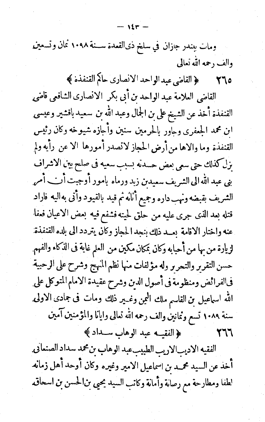 القاضى الْعَلامَة عبد الْوَاحِد بن أَبى بكر الأنصارى الشافعى قاضى القنفذة أَخذ عَن الشَّيْخ على بن الْجمال وَعبد الله بن سعيد باقشير وَعِيسَى ابْن مُحَمَّد الجعفرى وجاور بالحرمين سِنِين وَأَجَازَهُ شُيُوخه وَكَانَ رَئِيس القنفذة وَمَا والاها من ارْض الْحجاز لَا تصدر أمورها الا عَن رَأْيه وَلم يزل كَذَلِك حَتَّى سعى بعض حَسَدْته بِسَبَب سَعْيه فِي صلح بَين الْأَشْرَاف بنى عبد الله إِلَى الشريف سعيد بن زيد ورماه بِأُمُور أوجبت أَن أَمر الشريف بِقَبْضِهِ وَنهب دَاره وَجَمِيع أثاثه ثمَّ قيد بالقيود وأتى بِهِ إِلَيْهِ فَأَرَادَ قَتله بعد الذى جرى عَلَيْهِ من حلق لحيته فشفع فِيهِ بعض الْأَعْيَان فَعَفَا عَنهُ وَاخْتَارَ الْإِقَامَة بعد ذَلِك بِنَجْد الْحجاز وَكَانَ يتَرَدَّد إِلَى بَلَده القنفذة لزيارة من بهَا من أحبابه وَكَانَ بمَكَان مكين من الْعلم غَايَة فِي الذكاء والفهم حسن التَّقْرِير والتحرير وَله مؤلفات مِنْهَا نظم الْمنْهَج وَشرح على الرحبية فِي الْفَرَائِض ومنظومة فِي أصُول الدّين وَشرح عقيدة الإِمَام المتَوَكل على الله إِسْمَاعِيل بن الْقَاسِم ملك الْيمن وَغير ذَلِك وَمَات فِي جُمَادَى الأولى سنة 1089 تسع وَثَمَانِينَ وَألف رَحمَه الله تَعَالَى وإيانا وَالْمُؤمنِينَ آمين