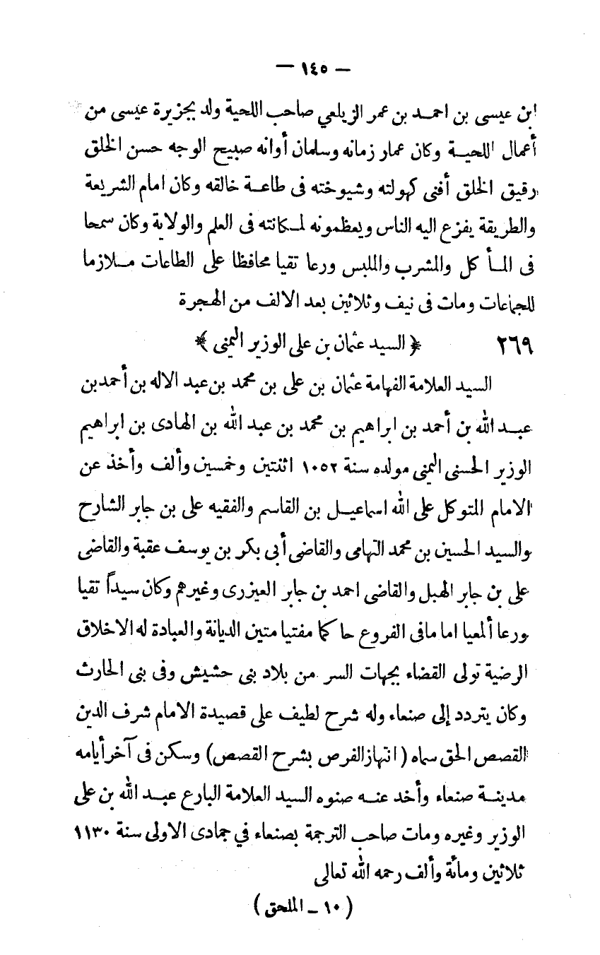 ابْن عِيسَى بن احْمَد بن عمر الزيلعى صَاحب اللِّحْيَة ولد بِجَزِيرَة عِيسَى من أَعمال اللِّحْيَة وَكَانَ عمار زَمَانه وسلمان أَوَانه صبيح الْوَجْه حسن الْخلق رَقِيق الْخلق أفنى كهولته وشيوخته فِي طَاعَة خالقه وَكَانَ امام الشَّرِيعَة والطريقة يفزع إِلَيْهِ النَّاس ويعظمونه لمكانته فِي الْعلم وَالْولَايَة وَكَانَ سَمحا فِي المأكل وَالْمشْرَب والملبس ورعا تقيا محافظا على الطَّاعَات ملازما للجماعات وَمَات فِي نَيف وَثَلَاثِينَ بعد الْألف من الْهِجْرَة