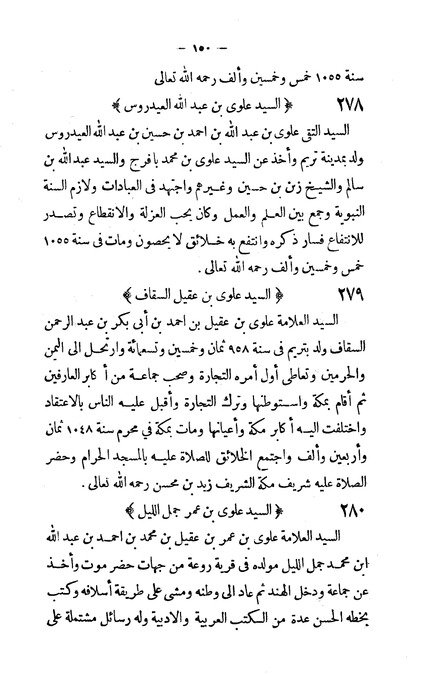 السَّيِّد الْعَلامَة علوى بن عمر بن عقيل بن مُحَمَّد بن احْمَد بن عبد الله ابْن مُحَمَّد جمل اللَّيْل مولده فِي قَرْيَة روعة من جِهَات حَضرمَوْت وَأخذ عَن جمَاعَة وَدخل الْهِنْد ثمَّ عَاد إِلَى وَطنه وَمَشى على طَريقَة أسلافه وَكتب بِخَطِّهِ الْحسن عدَّة من الْكتب الْعَرَبيَّة والأدبية وَله رسائل مُشْتَمِلَة على