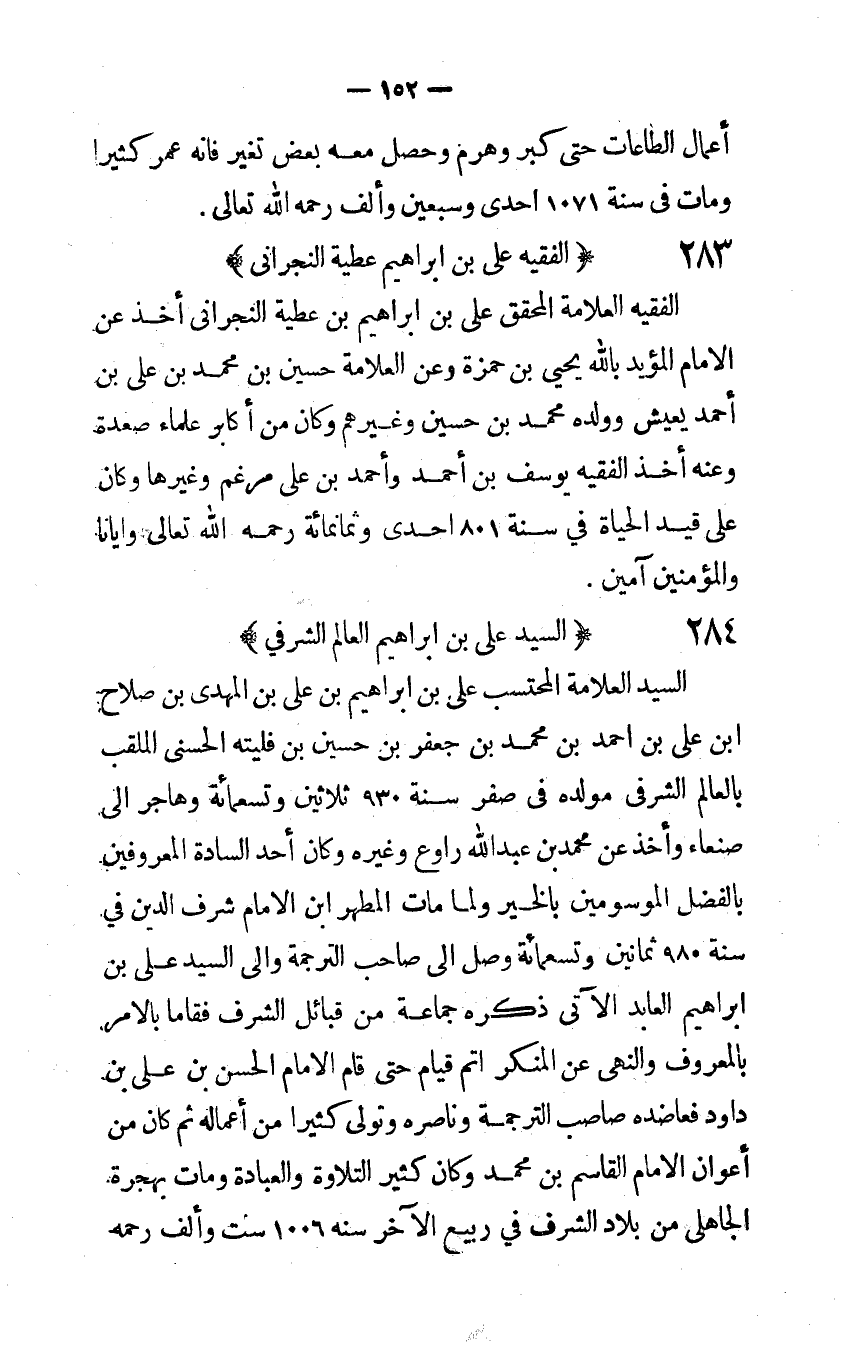 الْفَقِيه الْعَلامَة الْمُحَقق على بن إِبْرَاهِيم بن عَطِيَّة النجرانى اخذ عَن الإِمَام الْمُؤَيد بِاللَّه يحيى بن حَمْزَة وَعَن الْعَلامَة حُسَيْن بن مُحَمَّد بن على بن أَحْمد يعِيش وَولده مُحَمَّد بن حُسَيْن وَغَيرهم وَكَانَ من أكَابِر عُلَمَاء صعدة وَعنهُ أَخذ الْفَقِيه يُوسُف بن احْمَد وَأحمد بن على مرغم وَغَيرهَا وَكَانَ على قيد الْحَيَاة فِي سنة 801 احدى وَثَمَانمِائَة رَحمَه الله تَعَالَى وإيانا وَالْمُؤمنِينَ آمين