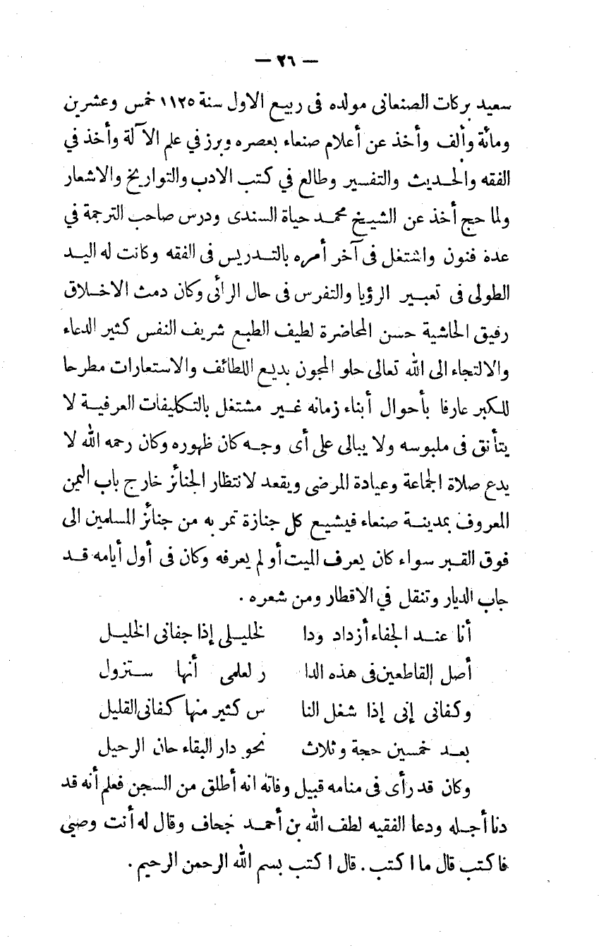 سعيد بَرَكَات الصنعانى مولده فِي ربيع الأول سنة 1125 خمس وَعشْرين وَمِائَة وَألف وَأخذ عَن أَعْلَام صنعاء بعصره وبرز فِي علم الْآلَة وَأخذ فِي الْفِقْه والْحَدِيث وَالتَّفْسِير وطالع فِي كتب الْأَدَب والتواريخ والأشعار وَلما حج أَخذ عَن الشَّيْخ مُحَمَّد حَيَاة السندى ودرس صَاحب التَّرْجَمَة فِي عدَّة فنون واشتغل فِي آخر أمره بالتدريس فِي الْفِقْه وَكَانَت لَهُ الْيَد الطُّولى فِي تَعْبِير الرُّؤْيَا والتفرس فِي حَال الرائى وَكَانَ دمث الْأَخْلَاق رَفِيق الْحَاشِيَة حسن المحاضرة لطيف الطَّبْع شرِيف النَّفس كثير الدُّعَاء والالتجاء إِلَى الله تَعَالَى حُلْو المجون بديع اللطائف والاستعارات مطرحا للكبر عَارِفًا بأحوال أَبنَاء زَمَانه غير مشتغل بالتكليفات الْعُرْفِيَّة لَا يتأنق فِي ملبوسه وَلَا يبالى على أى وَجه كَانَ ظُهُوره وَكَانَ رَحمَه الله لَا يدع صَلَاة الْجَمَاعَة وعيادة المرضى وَيقْعد لانتظار الْجَنَائِز خَارج بَاب الْيمن الْمَعْرُوف بِمَدِينَة صنعاء فيشيع كل جَنَازَة تمر بِهِ من جنائز الْمُسلمين إِلَى فَوق الْقَبْر سَوَاء كَانَ يعرف الْمَيِّت أَو لم يعرفهُ وَكَانَ فِي أول أَيَّامه قد جاب الديار وتنقل فِي الأقطار وَمن شعره