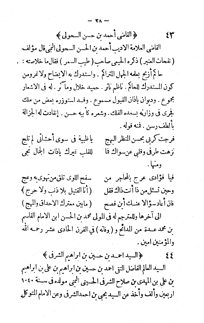 القاضى الْعَلامَة الأديب أَحْمد بن الْحسن السحولى الْيُمْنَى قَالَ مؤلف نفحات العنبر ذكره الحيمى صَاحب طيب السمر فَقَالَ مَا خلاصته
