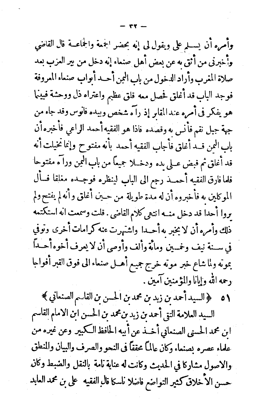 وَأمره ان يسلم على وَيَقُول لى إِنَّه يحضر الْجُمُعَة وَالْجَمَاعَة قَالَ القاضى وأخبرنى من أَثِق بِهِ عَن بعض أهل صنعاء إِنَّه دخل من بير العزب بعد صَلَاة الْمغرب وَأَرَادَ الدُّخُول من بَاب الْيمن أحد أَبْوَاب صنعاء الْمَعْرُوفَة فَوجدَ الْبَاب قد أغلق فَحصل مَعَه قلق عَظِيم واعتراه ذل ووحشة فَبَيْنَمَا هُوَ يفكر فِي أمره عِنْد الْمَقَابِر إِذْ رَآهُ شخص وَبِيَدِهِ فانوس وَقد جَاءَ من جِهَة جبل نقم فأنس بِهِ وقصده فَإِذا هُوَ الْفَقِيه أَحْمد الرَّاعِي فَأخْبرهُ ان بَاب الْيمن قد أغلق فَأجَاب الْفَقِيه أَحْمد بِأَنَّهُ مَفْتُوح وَإِنَّمَا تَخَيَّلت أَنه قد أغلق ثمَّ قبض على يَده ودخلا جَمِيعًا من بَاب الْيمن وَرَآهُ مَفْتُوحًا فَلَمَّا فَارق الْفَقِيه أَحْمد رَجَعَ إِلَى الْبَاب لينظره فَوَجَدَهُ مغلقا فَسَأَلَ الموكلين بِهِ فأخبروه أَن لَهُ مُدَّة طَوِيلَة من حِين أغلق وَأَنه لم يفتح وَلم يرَوا أحدا قد دخل مِنْهُ انْتهى كَلَام القاضى