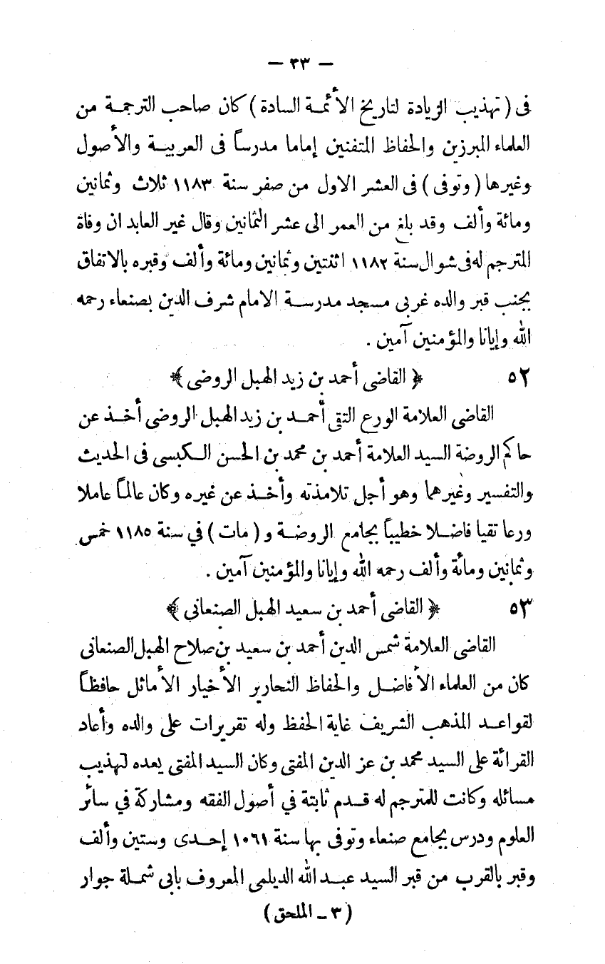 فِي تَهْذِيب الزِّيَادَة لتاريخ الْأَئِمَّة السَّادة كَانَ صَاحب التَّرْجَمَة من الْعلمَاء المبرزين والحفاظ المتفنين إِمَامًا مدرسا فِي الْعَرَبيَّة وَالْأُصُول وَغَيرهَا وَتوفى فِي الْعشْر الأول من صفر سنة 1183 ثَلَاث وَثَمَانِينَ وَمِائَة وَألف وَقد بلغ من الْعُمر إِلَى عشر الثَّمَانِينَ وَقَالَ غير العابد ان وَفَاة المترجم لَهُ فِي شَوَّال سنة 1182 اثْنَتَيْنِ وَثَمَانِينَ وَمِائَة وَألف وقبره بالِاتِّفَاقِ بِجنب قبر وَالِده غربى مَسْجِد مدرسة الإِمَام شرف الدّين بِصَنْعَاء رَحمَه الله وإيانا وَالْمُؤمنِينَ آمين
