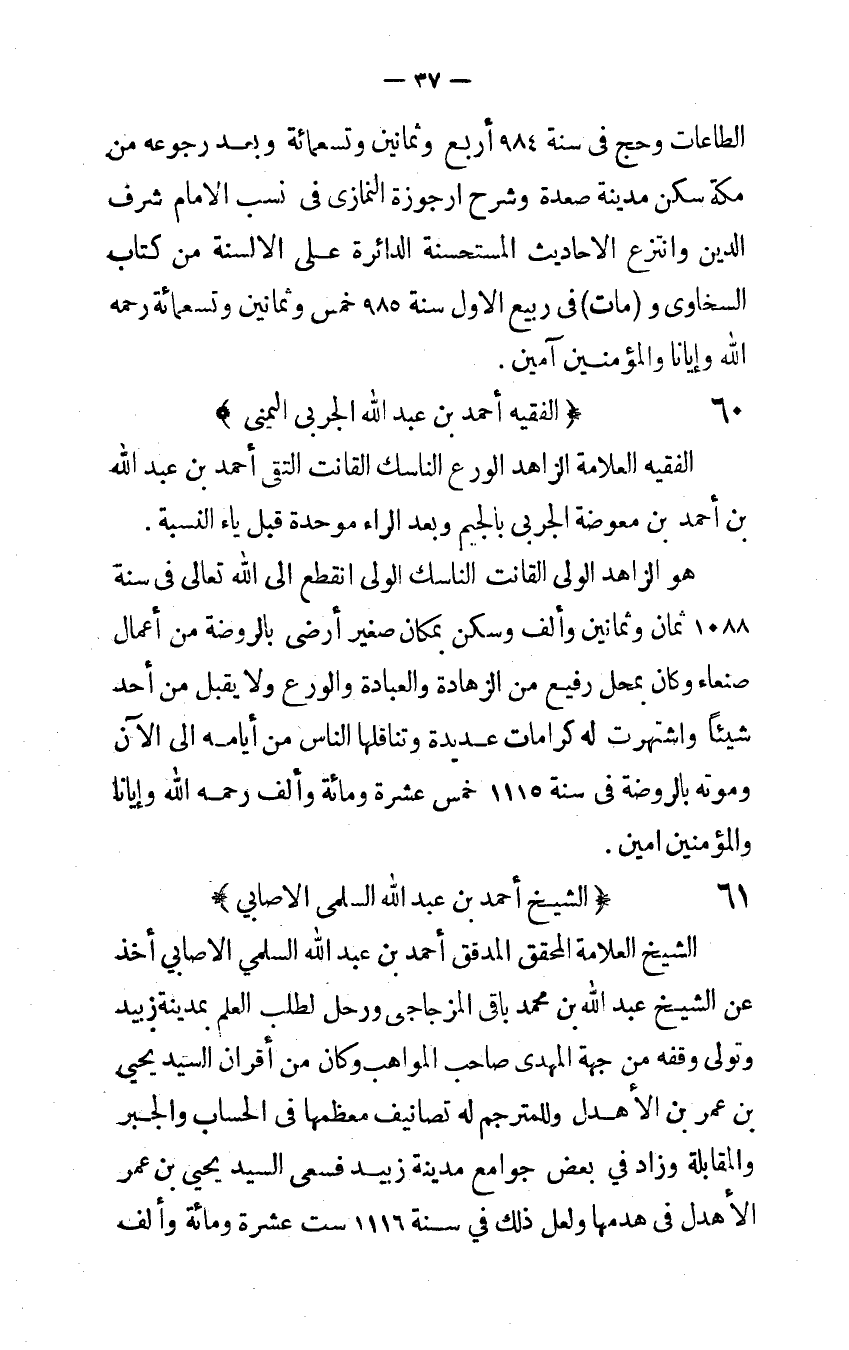 الشَّيْخ الْعَلامَة الْمُحَقق المدقق احْمَد بن عبد الله السلمى الأصابى أَخذ عَن الشَّيْخ عبد الله بن مُحَمَّد باقى المزجاجى ورحل لطلب الْعلم بِمَدِينَة زبيد وَتَوَلَّى وَقفه من جِهَة المهدى صَاحب الْمَوَاهِب وَكَانَ من أَقْرَان السَّيِّد يحيى بن عمر بن الأهدل وللمترجم لَهُ تصانيف معظمها فِي الْحساب والجبر والمقابلة وَزَاد فِي بعض جَوَامِع مَدِينَة زبيد فسعى السَّيِّد يحيى بن عمر الأهدل فِي هدمها وَلَعَلَّ ذَلِك فِي سنة 1116 سِتّ عشرَة وَمِائَة وَألف
