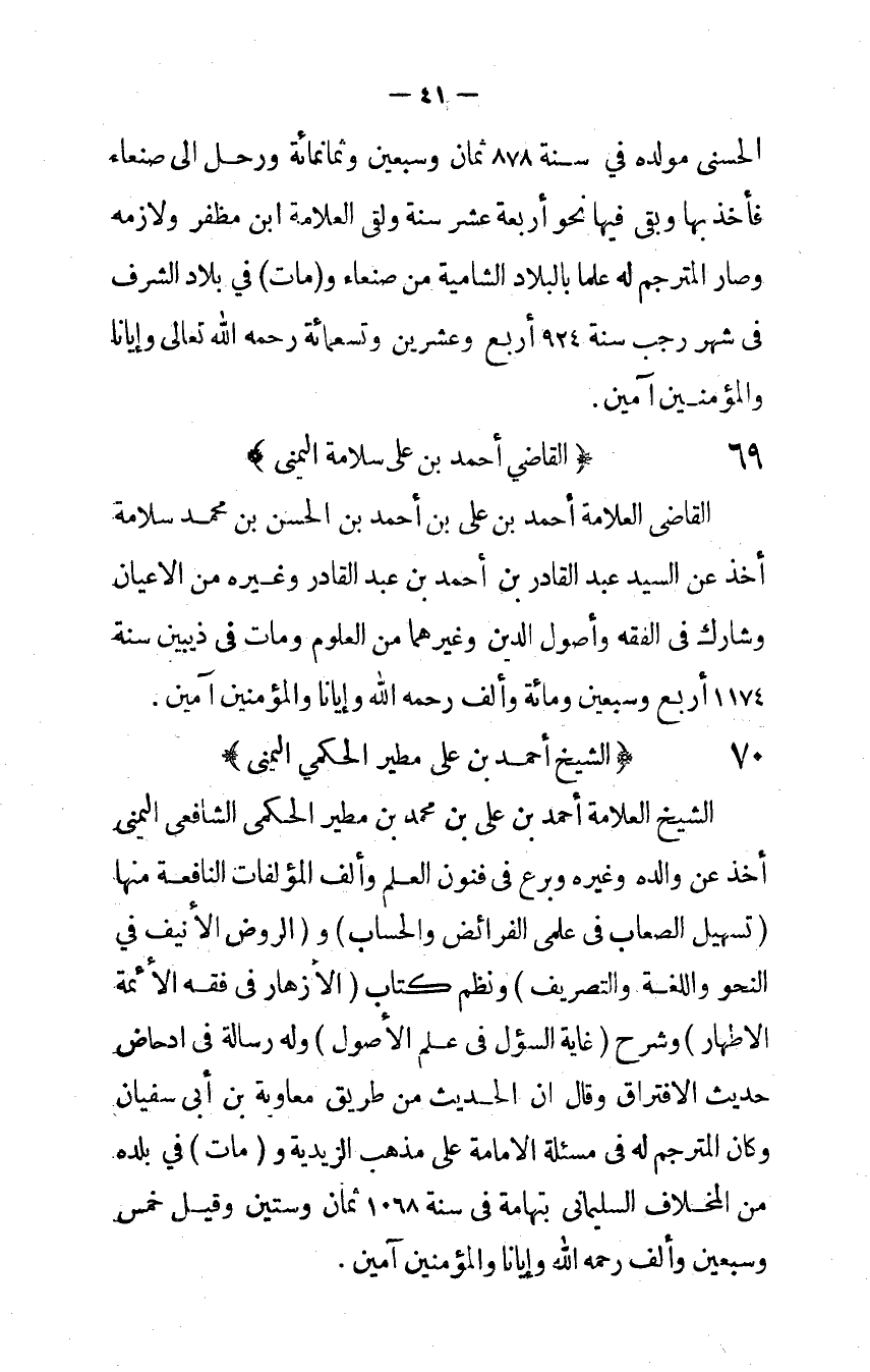 القاضى الْعَلامَة أَحْمد بن على بن أَحْمد بن الْحسن بن مُحَمَّد سَلامَة أَخذ عَن السَّيِّد عبد الْقَادِر بن أَحْمد بن عبد الْقَادِر وَغَيره من الْأَعْيَان وشارك فِي الْفِقْه وأصول الدّين وَغَيرهمَا من الْعُلُوم وَمَات فِي ذيبين سنة 1174 أَربع وَسبعين وَمِائَة وَألف رَحمَه الله وإيانا وَالْمُؤمنِينَ آمين