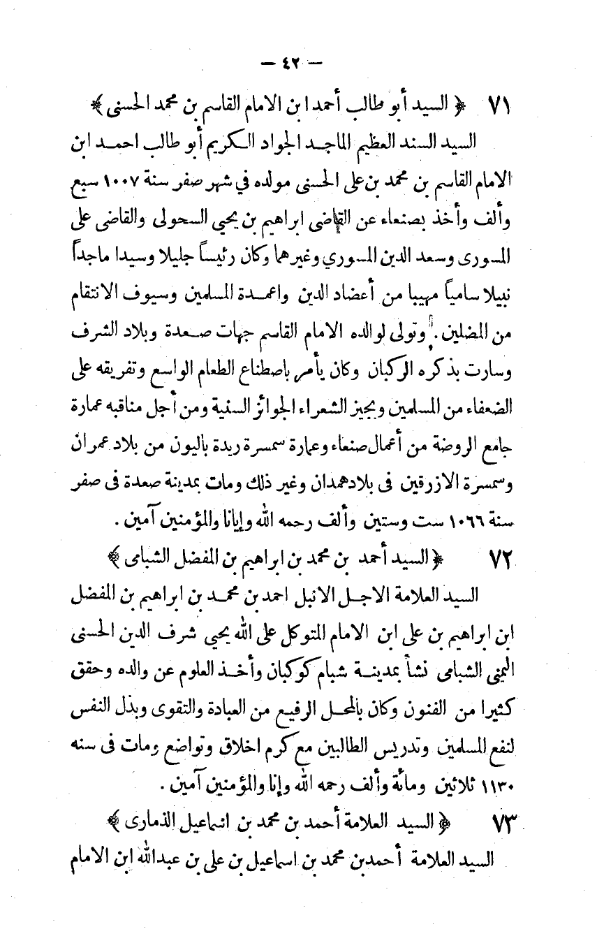 السَّيِّد الْعَلامَة الْأَجَل الانبل احْمَد بن مُحَمَّد بن إِبْرَاهِيم بن الْمفضل ابْن إِبْرَاهِيم بن على ابْن الإِمَام المتَوَكل على الله يحيى شرف الدّين الْحسنى الْيُمْنَى الشبامى نَشأ بِمَدِينَة شبام كوكبان وَأخذ الْعُلُوم عَن وَالِده وحقق كثيرا من الْفُنُون وَكَانَ بِالْمحل الرفيع من الْعِبَادَة وَالتَّقوى وبذل النَّفس لنفع الْمُسلمين وتدريس الطالبين مَعَ كرم اخلاق وتواضع وَمَات فِي سنة 1130 ثَلَاثِينَ وَمِائَة وَألف رَحمَه الله وإيانا وَالْمُؤمنِينَ آمين