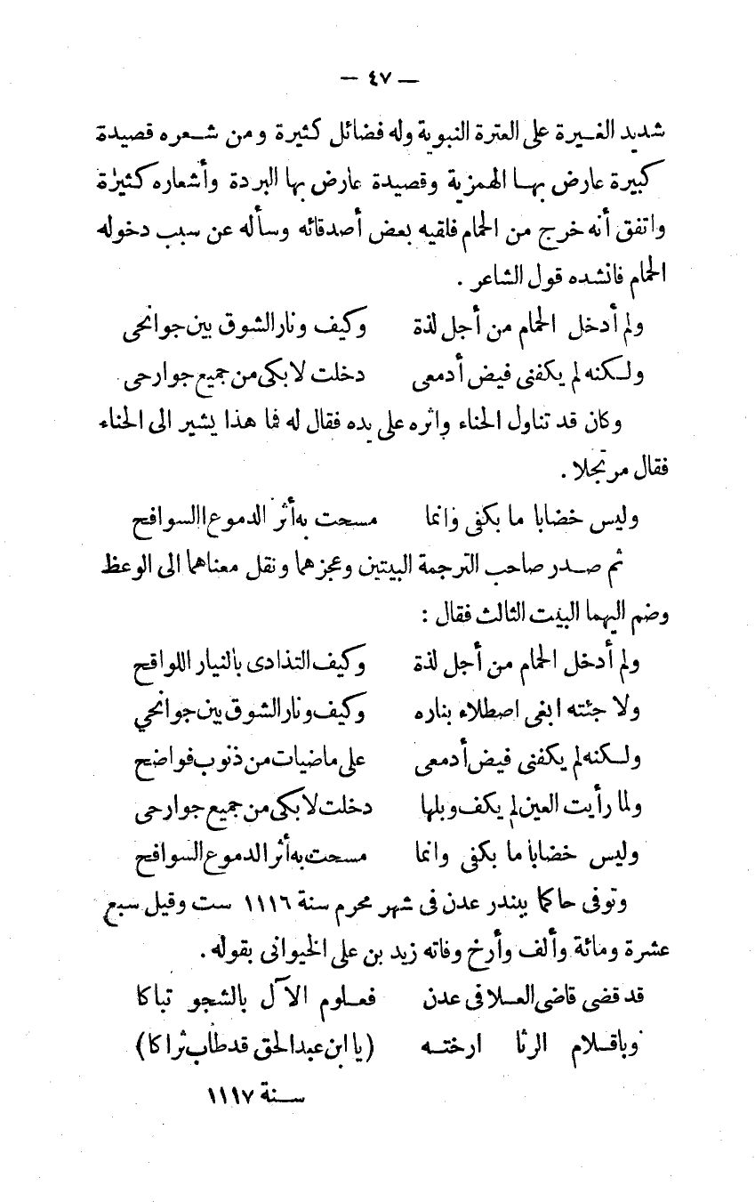 وَتوفى حَاكما ببندر عدن فِي شهر محرم سنة 1116 سِتّ وَقيل سبع عشرَة وَمِائَة وَألف وأرخ وَفَاته زيد بن على الخيوانى بقوله