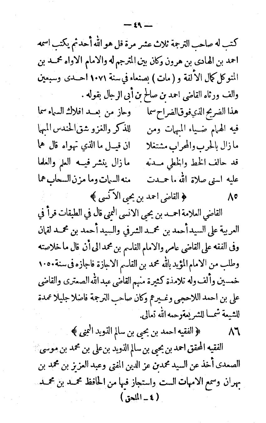القاضى الْعَلامَة احْمَد بن يحيى الآنسى الْيُمْنَى قَالَ فِي الطَّبَقَات قَرَأَ فِي الْعَرَبيَّة على السَّيِّد أَحْمد بن مُحَمَّد الشرفي وَالسَّيِّد أَحْمد بن مُحَمَّد لُقْمَان وَفِي الْفِقْه على القاضى عَامر وَالْإِمَام الْقَاسِم بن مُحَمَّد إِلَى أَن قَالَ مَا خلاصته وَطلب من الإِمَام الْمُؤَيد بِاللَّه مُحَمَّد بن الْقَاسِم الْإِجَازَة فَأَجَازَهُ فِي سنة 1050 خمسين وَألف وَله تلامذة كَثِيرَة مِنْهُم القاضى عبد الله الصعترى والقاضى على بن احْمَد اللاحجى وَغَيرهم وَكَانَ صَاحب التَّرْجَمَة فَاضلا جَلِيلًا عُمْدَة للشيعة شمسا للشريعة رَحمَه الله تَعَالَى