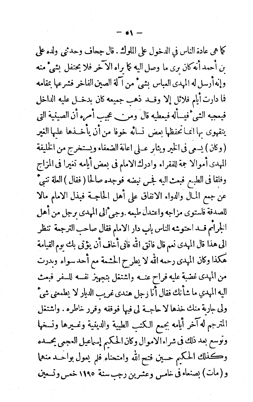وجئ إِلَى المهدى بِرَجُل من أهل الجرائم قد احتوشه النَّاس بَاب دَار الإِمَام فَقَالَ صَاحب التَّرْجَمَة تنظر إِلَى هَذَا قَالَ المهدى نعم قَالَ فَاتق الله فإنى أَخَاف أَن يُؤْتى بك يَوْم الْقِيَامَة هَكَذَا وَكَانَ المهدى رَحمَه الله لَا يطْرَح الحشمة مَعَ أحد سواهُ وبدرت من المهدى غضبة عَلَيْهِ فراح عَنهُ واشتغل بتجهيز نَفسه للسَّفر فَبعث إِلَيْهِ المهدى مَا شَأْنك فَقَالَ أَنا رجل هندى غَرِيب الديار لَا يطمعنى شئ ولى جَارِيَة مِنْك خُذْهَا لَا حَاجَة لى فِيهَا فَوَقفهُ وَقرر خاطره