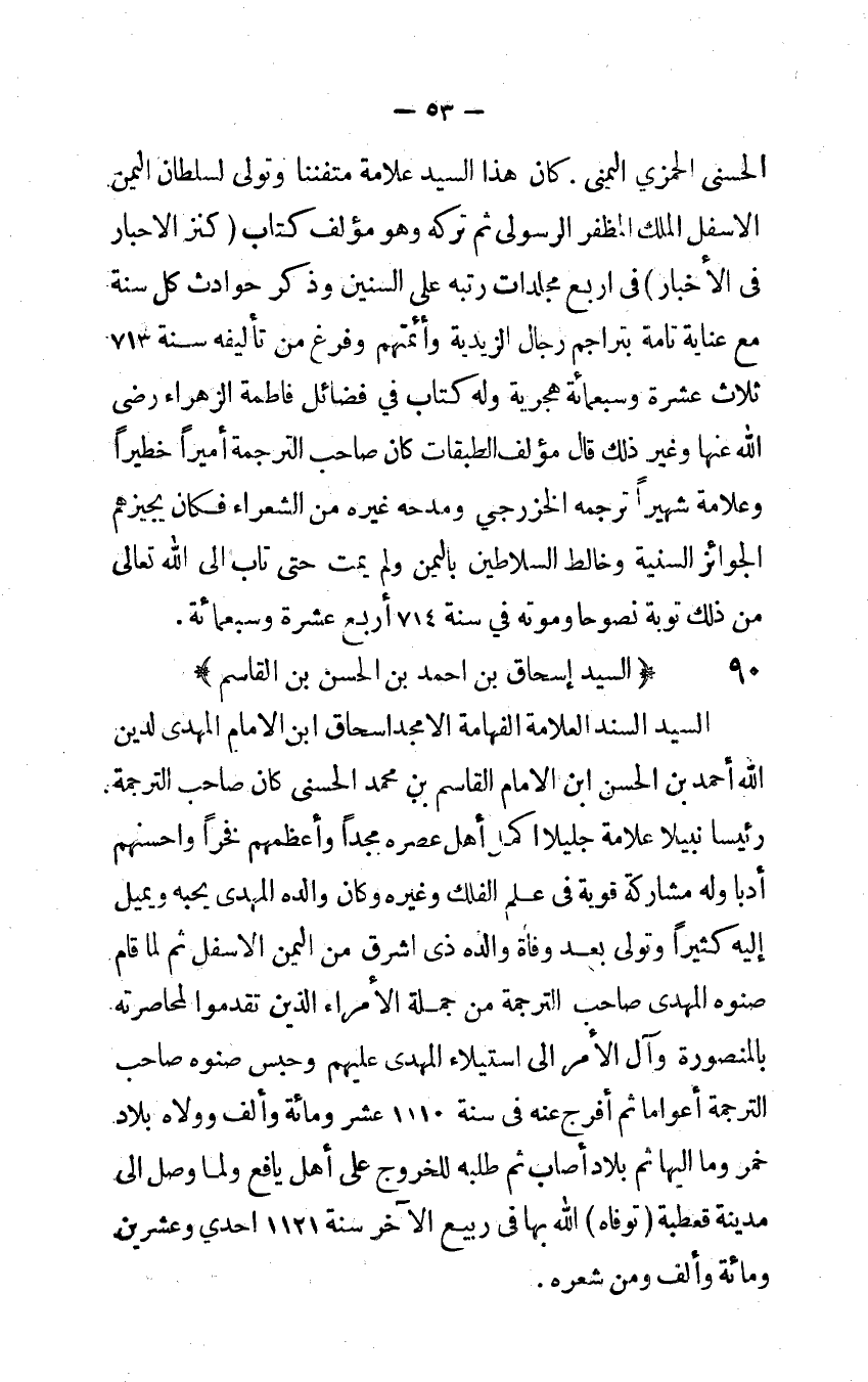 كَانَ هَذَا السَّيِّد عَلامَة متفننا وَتَوَلَّى لسلطان الْيمن الْأَسْفَل الْملك المظفر الرسولى ثمَّ تَركه وَهُوَ مؤلف كتاب كنز الْأَحْبَار فِي الْأَخْبَار فِي ارْبَعْ مجلدات رتبه على السنين وَذكر حوادث كل سنة مَعَ عناية تَامَّة بتراجم رجال الزيدية وأئمتهم وَفرغ من تأليفه سنة 713 ثَلَاث عشرَة وَسَبْعمائة هجرية وَله كتاب فِي فَضَائِل فَاطِمَة الزهراء رضى الله عَنْهَا وَغير ذَلِك قَالَ مؤلف الطَّبَقَات كَانَ صَاحب التَّرْجَمَة اميرا خطيرا وعلامة شهيرا تَرْجمهُ الخزرجي ومدحه غَيره من الشُّعَرَاء فَكَانَ يجيزهم الجوائز السّنيَّة وخالط السلاطين بِالْيمن وَلم يمت حَتَّى تَابَ إِلَى الله تَعَالَى من ذَلِك تَوْبَة نصُوحًا وَمَوته فِي سنة 714 أَربع عشرَة وَسَبْعمائة
