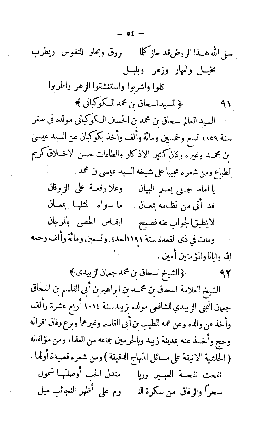السَّيِّد الْعَالم اسحاق بن مُحَمَّد بن الْحُسَيْن الكوكبانى مولده فِي صفر سنة 1159 تسع وَخمسين وَمِائَة وَألف وَأخذ بكوكبان عَن السَّيِّد عِيسَى ابْن مُحَمَّد وَغَيره وَكَانَ كثير الْأَذْكَار والطاعات حسن الْأَخْلَاق كريم الطباع وَمن شعره مجيبا على شَيْخه السَّيِّد عِيسَى بن مُحَمَّد