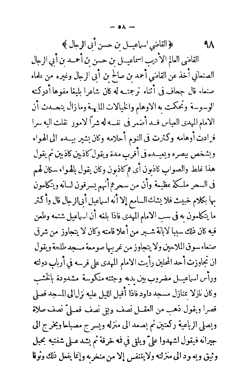 القاضى الْعَالم الأديب إِسْمَاعِيل بن حسن بن أَحْمد بن أبي الرِّجَال الصَّنْعَانِيّ أَخذ عَن القاضى أَحْمد بن صَالح بن أَبى الرِّجَال وَغَيره من عُلَمَاء صنعاء قَالَ جحاف فِي أثْنَاء تَرْجَمته لَهُ كَانَ شَاعِرًا بليغا مفوها أَدْرَكته الوسوسة وتحكمت بِهِ الأوهام والخيالات الملبسة ومازال يتحدث أَن الإِمَام المهدى الْعَبَّاس قد أضمر فِي نَفسه لَهُ شرا لأمور نقلت إِلَيْهِ سرا فزادت أَوْهَامه وَكَثُرت فِي النّوم أحلامه وَكَانَ يُشِير بِيَدِهِ إِلَى الْهَوَاء ويشخص ببصره ويعيده فِي أقرب مُدَّة وَيَقُول كاذبين كاذبين ثمَّ يَقُول هَذَا غلط وَالصَّوَاب كاذبون أى هم كاذبون وَكَانَ يَقُول بالهواء سكان لَهُم فِي السحر ملكة عَظِيمَة وَأَن من سحرهم أَنهم يسرقون لِسَانه ويتكلمون بهَا بِكَلَام خَبِيث فَلَا يشك السَّامع إِلَّا أَنه إِسْمَاعِيل أَبى الرِّجَال قَالَ وَأكْثر مَا يَتَكَلَّمُونَ بِهِ فِي سبّ الإِمَام المهدى فَإِذا بلغه أَن إِسْمَاعِيل شَتمه وَطعن فِيهِ كَانَ ذَلِك سَببا لإبانة شبر من أعلا قامته وَكَانَ لَا يتَجَاوَز من شرقى صنعاء سوق الملاحين وَلَا يتَجَاوَز من غربيها صومعة مَسْجِد طَلْحَة وَيَقُول ان تجاوزت أحد المحلين رَأَيْت الإِمَام المهدى على فرسه فِي أَرْبَاب دولته وَرَأس إِسْمَاعِيل مَضْرُوب بَين يَدَيْهِ وجثته منكوسة مشدودة بالخشب وَكَانَ نازلا بمنازل مَسْجِد دَاوُد فَإِذا أقبل اللَّيْل عَلَيْهِ نزل إِلَى الْمَسْجِد فصلى قصرا وَيَقُول ذهب من الْعقل نصف وبقى نصف فعلى نصف صَلَاة وَيصلى الرّبَاعِيّة رَكْعَتَيْنِ ثمَّ يصعد إِلَى منزله ويسرج مصباحا وَيخرج إِلَى جِيرَانه فَيَقُول اشْهَدُوا على ويلقى فِي فَمه خرقَة ثمَّ يشد على شَفَتَيْه بِحَبل وثيق وَيعود إِلَى مَنْزِلَته وَلَا يتنفس إِلَّا من مَنْخرَيْهِ وَإِنَّمَا يفعل ذَلِك وثوقا
