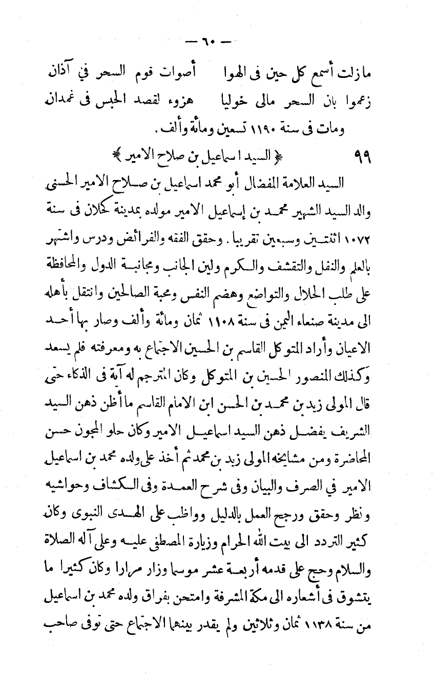 وحقق الْفِقْه والفرائض ودرس واشتهر بِالْعلمِ وَالنَّفْل والتقشف وَالْكَرم ولين الْجَانِب ومجانبة الدول والمحافظة على طلب الْحَلَال والتواضع وهضم النَّفس ومحبة الصَّالِحين وانتقل بأَهْله إِلَى مَدِينَة صنعاء الْيمن فِي سنة 1108 ثَمَان وَمِائَة وَألف وَصَارَ بهَا أحد الْأَعْيَان وَأَرَادَ المتَوَكل الْقَاسِم بن الْحُسَيْن الِاجْتِمَاع بِهِ ومعرفته فَلم يسْعد وَكَذَلِكَ الْمَنْصُور الْحُسَيْن بن المتَوَكل وَكَانَ المترجم لَهُ آيَة فِي الذكاء حَتَّى قَالَ الْمولى زيد بن مُحَمَّد بن الْحسن ابْن الإِمَام الْقَاسِم مَا أَظن ذهن السَّيِّد الشريف يفضل ذهن السَّيِّد إِسْمَاعِيل الْأَمِير وَكَانَ حُلْو المجون حسن المحاضرة وَمن مشايخه الْمولى زيد بن مُحَمَّد ثمَّ أَخذ على وَلَده مُحَمَّد بن إِسْمَاعِيل الْأَمِير فِي الصّرْف وَالْبَيَان وَفِي شرح الْعُمْدَة وَفِي الْكَشَّاف وحواشيه وَنظر وحقق وَرجح الْعَمَل بِالدَّلِيلِ وواظب على الْهدى النبوى وَكَانَ كثير التَّرَدُّد إِلَى بَيت الله الْحَرَام وزيارة الْمُصْطَفى عَلَيْهِ وعَلى آله الصَّلَاة وَالسَّلَام وَحج على قدمه أَرْبَعَة عشر موسما وزار مرَارًا وَكَانَ كثيرا مَا يتشوق فِي أشعاره إِلَى مَكَّة المشرفة وامتحن بِفِرَاق وَلَده مُحَمَّد بن إِسْمَاعِيل من سنة 1138 ثَمَان وَثَلَاثِينَ وَلم يقدر بَينهمَا الِاجْتِمَاع حَتَّى توفى صَاحب