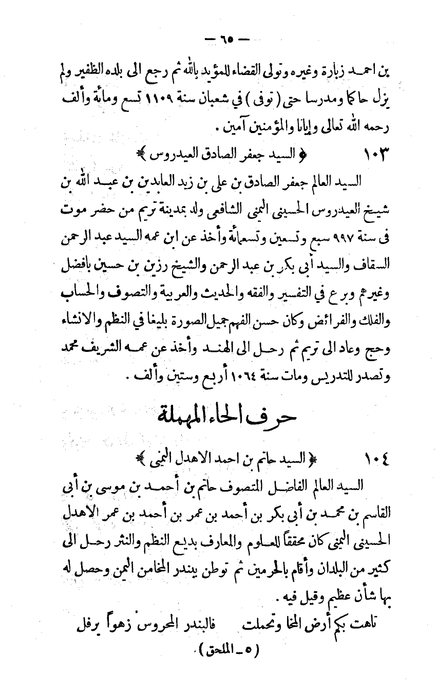 السَّيِّد الْعَالم جَعْفَر الصَّادِق بن على بن زيد العابدين بن عبد الله بن شيخ العيدروس الحسينى الْيُمْنَى الشافعى ولد بِمَدِينَة تريم من حَضرمَوْت فِي سنة 997 سبع وَتِسْعين وَتِسْعمِائَة وَأخذ عَن ابْن عَمه السَّيِّد عبد الرَّحْمَن السقاف وَالسَّيِّد أَبى بكر بن عبد الرَّحْمَن وَالشَّيْخ رزين بن حُسَيْن بَافضل وَغَيرهم وبرع فِي التَّفْسِير وَالْفِقْه والْحَدِيث والعربية والتصوف والحساب والفلك والفرائض وَكَانَ حسن الْفَهم جميل الصُّورَة بليغا فِي النّظم والإنشاء وَحج وَعَاد إِلَى تريم ثمَّ رَحل إِلَى الْهِنْد وَأخذ عَن عَمه الشريف مُحَمَّد وتصدر للتدريس وَمَات سنة 1064 أَربع وَسِتِّينَ وَألف