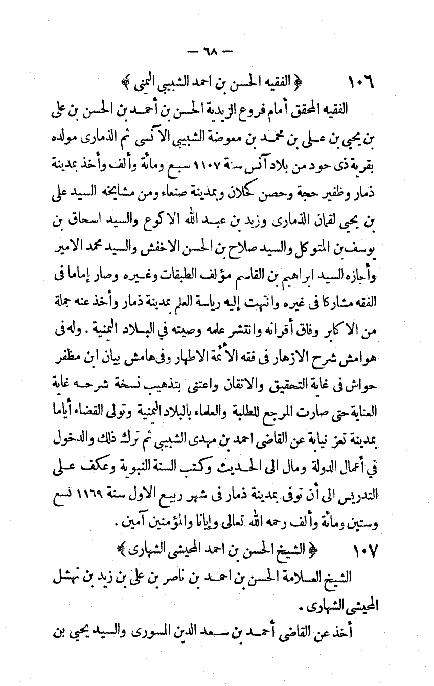 الْفَقِيه الْمُحَقق أَمَام فروع الزيدية الْحسن بن أَحْمد بن الْحسن بن على بن يحيى بن على بن مُحَمَّد بن معوضة الشبيبي الآنسى ثمَّ الذمارى مولده بقرية ذى حود من بِلَاد آنس سنة 1107 سبع وَمِائَة وَألف وَأخذ بِمَدِينَة ذمار وظفير حجَّة وحصن كحلان وبمدينة صنعاء وَمن مشايخه السَّيِّد على بن يحيى لُقْمَان الذمارى وَزيد بن عبد الله الْأَكْوَع وَالسَّيِّد اسحاق بن يُوسُف بن المتَوَكل وَالسَّيِّد صَلَاح بن الْحسن الْأَخْفَش وَالسَّيِّد مُحَمَّد الْأَمِير وَأَجَازَهُ السَّيِّد إِبْرَاهِيم بن الْقَاسِم مؤلف الطَّبَقَات وَغَيره وَصَارَ إِمَامًا فِي الْفِقْه مشاركا فِي غَيره وانتهت إِلَيْهِ رياسة الْعلم بِمَدِينَة ذمار وَأخذ عَنهُ جملَة من الأكابر وفَاق أقرانه وانتشر علمه وَصيته فِي الْبِلَاد اليمنية