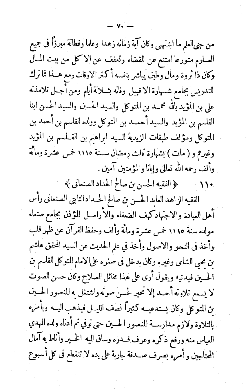 - الْفَقِيه الزَّاهِد العابد الْحسن بن صَالح الْحداد الثابتى الصنعانى رَأس أهل الْعِبَادَة وَالِاجْتِهَاد كَهْف الضُّعَفَاء والأرامل الْمُؤَذّن بِجَامِع صنعاء مولده سنة 1115 خمس عشرَة وَمِائَة وَألف وَحفظ الْقُرْآن عَن ظهر قلب وَأخذ فِي النَّحْو وَالْأُصُول وَأخذ فِي علم الحَدِيث عَن السَّيِّد الْمُحَقق هَاشم بن يحيى الشامى وَغَيره وَكَانَ يدْخل فِي صغره على الإِمَام المتَوَكل الْقَاسِم بن الْحُسَيْن فيدنيه وَيَقُول أرى على هَذَا مخائل الصّلاح وَكَانَ حسن الصَّوْت لَا يسمع تِلَاوَته أحد إِلَّا تحير لحسن صَوته واشتغل بِهِ الْمَنْصُور الْحُسَيْن بن المتَوَكل وَكَانَ يستدعيه كثيرا نصف اللَّيْل فَيذْهب إِلَيْهِ ويأمره بالتلاوة ولازم مدارسة الْمَنْصُور الْحُسَيْن حَتَّى توفّي ثمَّ أدناه وَلَده الْمهْدي الْعَبَّاس مِنْهُ وَرفع ذكره وَعرف قدره وسَاق إِلَيْهِ الْخَيْر وأناط بِهِ آمال المحتاجين وَأمره بِصَرْف صَدَقَة جَارِيَة على يَده لَا تَنْقَطِع فِي كل أُسْبُوع