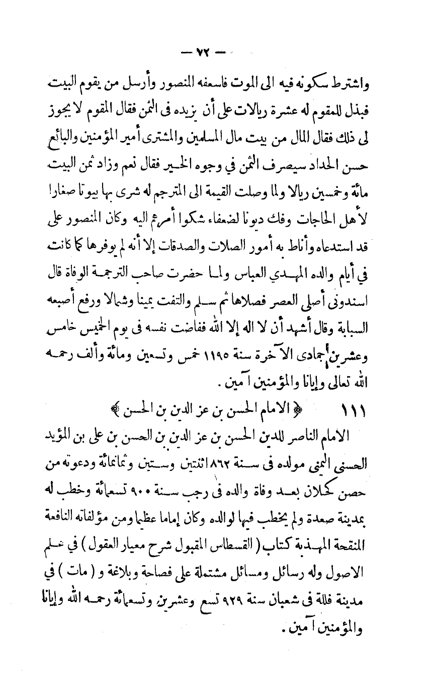 وَاشْترط سكونه فِيهِ إِلَى الْمَوْت فأسعفه الْمَنْصُور وَأرْسل من يقوم الْبَيْت فبذل للمقوم لَهُ عشرَة ريالات على أَن يزِيدهُ فِي الثّمن فَقَالَ الْمُقَوّم لَا يجوز لى ذَلِك فَقَالَ المَال من بَيت مَال الْمُسلمين والمشترى أَمِير الْمُؤمنِينَ وَالْبَائِع حسن الْحداد سيصرف الثّمن فِي وُجُوه الْخَيْر فَقَالَ نعم وَزَاد ثمن الْبَيْت مائَة وَخمسين ريالا وَلما وصلت الْقيمَة إِلَى المترجم لَهُ شرى بهَا بُيُوتًا صغَارًا لأهل الْحَاجَات وَفك ديونا لِضُعَفَاء شكوا أَمرهم إِلَيْهِ وَكَانَ الْمَنْصُور على قد استدعاه وأناط بِهِ أُمُور الصلات وَالصَّدقَات إِلَّا أَنه لم يوفرها كَمَا كَانَت فِي أَيَّام وَالِده الْمهْدي الْعَبَّاس وَلما حضرت صَاحب التَّرْجَمَة الْوَفَاة قَالَ اسندونى أصلى الْعَصْر فَصلاهَا ثمَّ سلم والتفت يَمِينا وَشمَالًا وَرفع أُصْبُعه السبابَة وَقَالَ أشهد أَن لَا اله إِلَّا الله فَفَاضَتْ نَفسه فِي يَوْم الْخَمِيس خَامِس وَعشْرين جُمَادَى الْآخِرَة سنة 1195 خمس وَتِسْعين وَمِائَة وَألف رَحمَه الله تَعَالَى وإيانا وَالْمُؤمنِينَ آمين