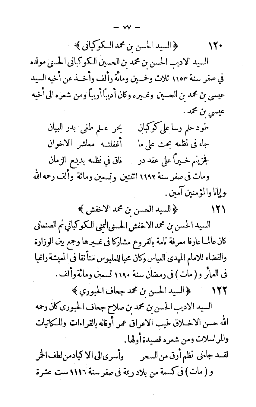 السَّيِّد الأديب الْحسن بن مُحَمَّد بن الْحُسَيْن الكوكبانى الْحسنى مولده فِي صفر سنة 1153 ثَلَاث وَخمسين وَمِائَة وَألف وَأخذ عَن أَخِيه السَّيِّد عِيسَى بن مُحَمَّد بن الْحُسَيْن وَغَيره وَكَانَ أديبا أريبا وَمن شعره إِلَى أَخِيه عِيسَى بن مُحَمَّد