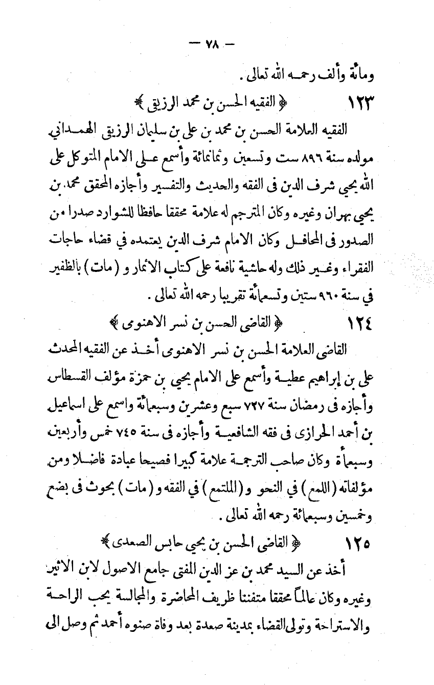 الْفَقِيه الْعَلامَة الْحسن بن مُحَمَّد بن على بن سُلَيْمَان الرزيقى الْهَمدَانِي مولده سنة 896 سِتّ وَتِسْعين وَثَمَانمِائَة وأسمع على الإِمَام المتَوَكل على الله يحيى شرف الدّين فِي الْفِقْه والْحَدِيث وَالتَّفْسِير وَأَجَازَهُ الْمُحَقق مُحَمَّد بن يحيى بهران وَغَيره وَكَانَ المترجم لَهُ عَلامَة محققا حَافِظًا للشوارد صَدرا من الصُّدُور فِي المحافل وَكَانَ الإِمَام شرف الدّين يعتمده فِي قَضَاء حاجات الْفُقَرَاء وَغير ذَلِك وَله حَاشِيَة نافعة على كتاب الأثمار وَمَات بالظفير فِي سنة 960 سِتِّينَ وَتِسْعمِائَة تَقْرِيبًا رَحمَه الله تَعَالَى