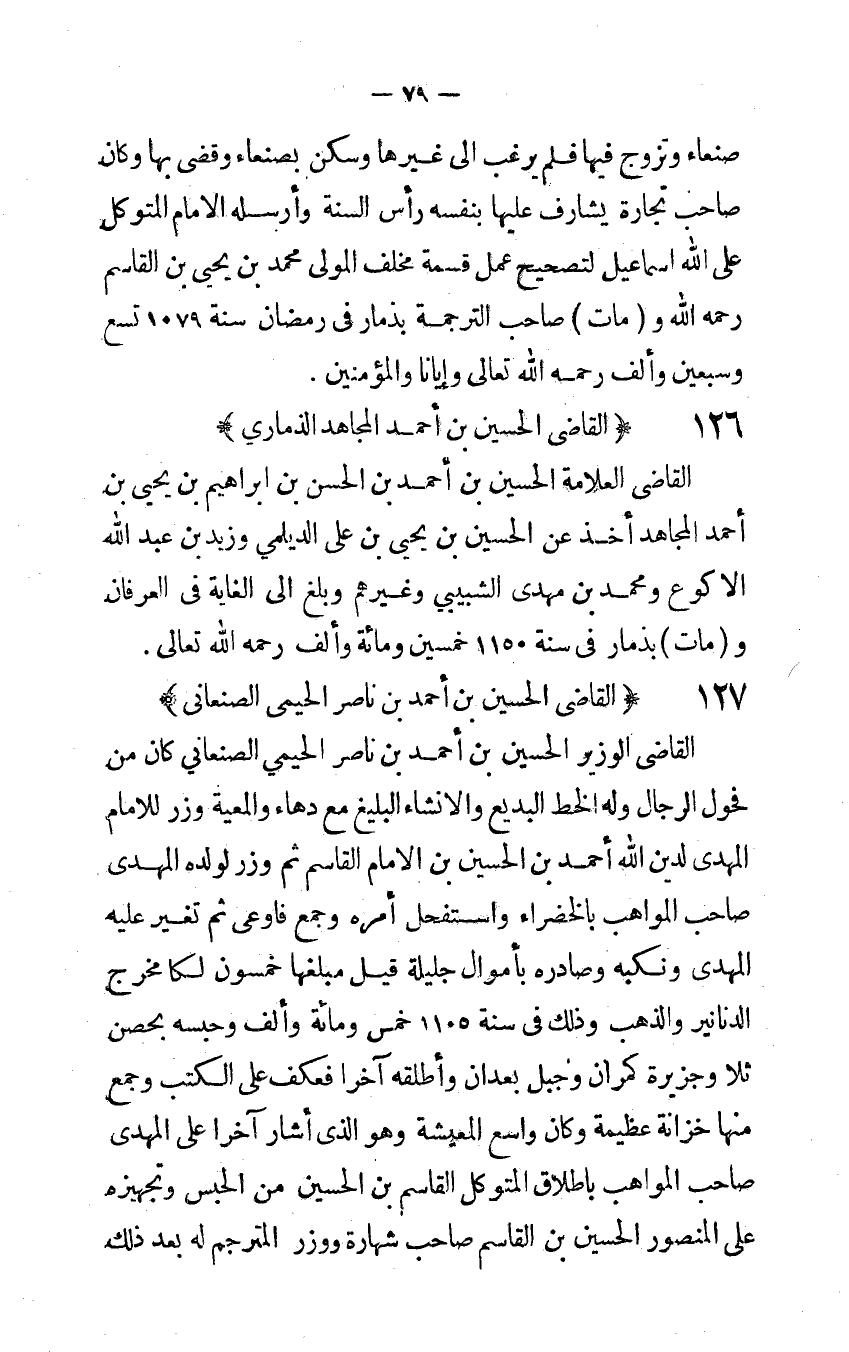 صنعاء وَتزَوج فِيهَا فَلم يرغب إِلَى غَيرهَا وَسكن بِصَنْعَاء وَقضى بهَا وَكَانَ صَاحب تِجَارَة يشارف عَلَيْهَا بِنَفسِهِ رَأس السّنة وأرسله الإِمَام المتَوَكل على الله إِسْمَاعِيل لتصحيح عمل قسْمَة مخلف الْمولى مُحَمَّد بن يحيى بن الْقَاسِم رَحمَه الله وَمَات صَاحب التَّرْجَمَة بذمار فِي رَمَضَان سنة 1079 تسع وَسبعين وَألف رَحمَه الله تَعَالَى وإيانا وَالْمُؤمنِينَ آمين