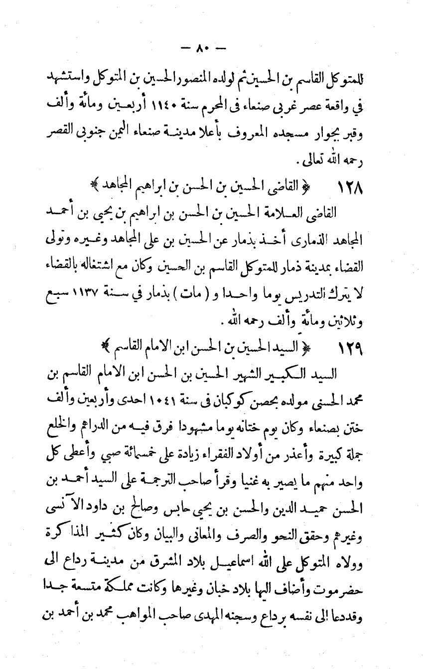 السَّيِّد الْكَبِير الشهير الْحُسَيْن بن الْحسن ابْن الإِمَام الْقَاسِم بن مُحَمَّد الْحسنى مولده بحصن كوكبان فِي سنة 1041 احدى وَأَرْبَعين وَألف ختن بِصَنْعَاء وَكَانَ يَوْم ختانه يَوْمًا مشهودا فرق فِيهِ من الدَّرَاهِم وَالْخلْع جملَة كَبِيرَة وأعذر من أَوْلَاد الْفُقَرَاء زِيَادَة على خَمْسمِائَة صبي وَأعْطى كل وَاحِد مِنْهُم مَا يصير بِهِ غَنِيا وَقَرَأَ صَاحب التَّرْجَمَة على السَّيِّد أَحْمد بن الْحسن حميد الدّين وَالْحسن بن يحيى حَابِس وَصَالح بن دَاوُد الآنسى وَغَيرهم وحقق النَّحْو وَالصرْف والمعانى وَالْبَيَان وَكَانَ كثير المذاكرة وولاه المتَوَكل على الله إِسْمَاعِيل بِلَاد الْمشرق من مَدِينَة رداع إِلَى حَضرمَوْت وأضاف إِلَيْهَا بِلَاد خبان وَغَيرهَا وَكَانَت مملكة متسعة جدا وَقد دَعَا إِلَى نَفسه برداع وسجنه المهدى صَاحب الْمَوَاهِب مُحَمَّد بن أَحْمد بن