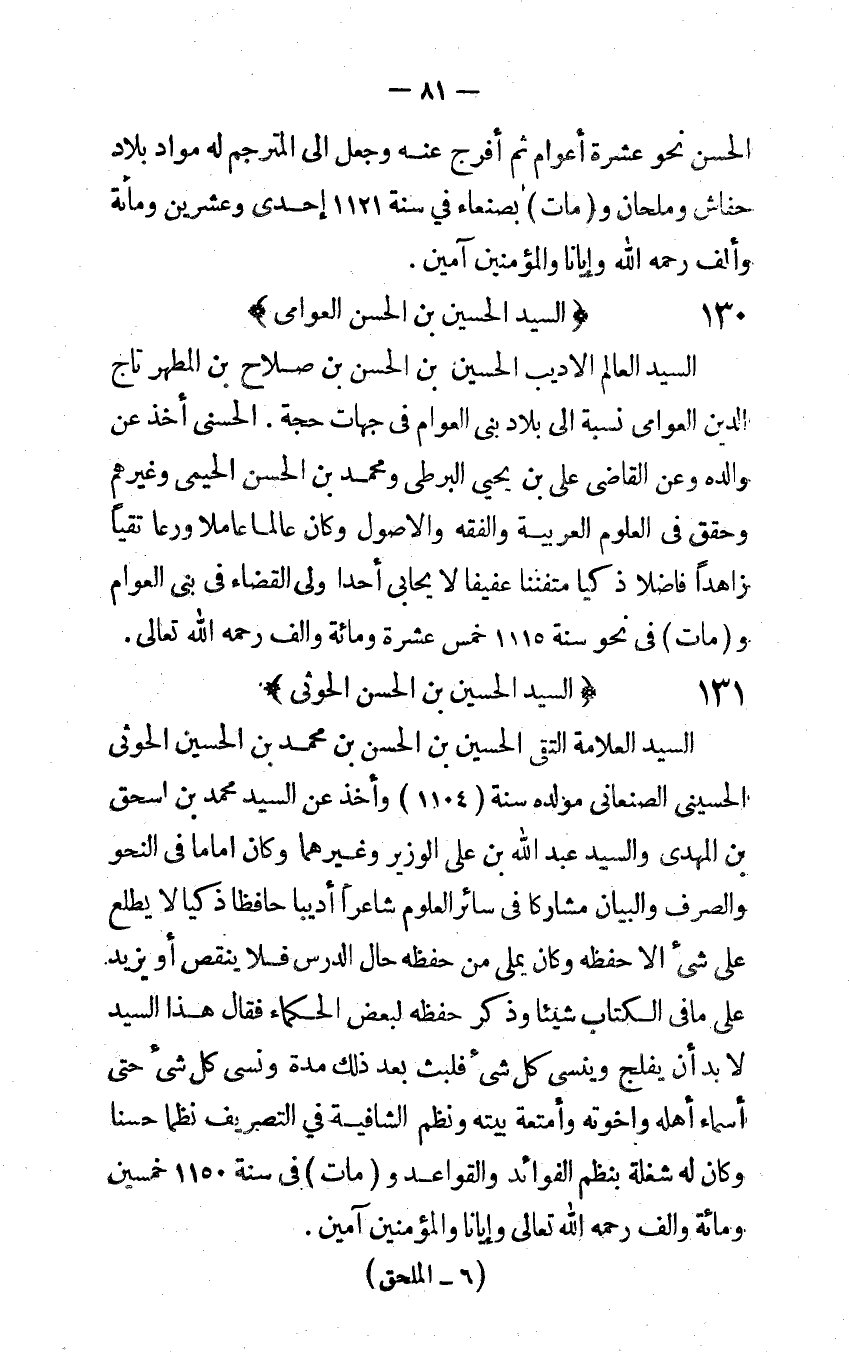 السَّيِّد الْعَلامَة التقى الْحُسَيْن بن الْحسن بن مُحَمَّد بن الْحُسَيْن الحوثى الحسينى الصنعانى مولده سنة 1104 وَأخذ عَن السَّيِّد مُحَمَّد بن اسحق بن المهدى وَالسَّيِّد عبد الله بن على الْوَزير وَغَيرهمَا وَكَانَ اماما فِي النَّحْو وَالصرْف وَالْبَيَان مشاركا فِي سَائِر الْعُلُوم شَاعِرًا أديبا حَافِظًا ذكيا لَا يطلع على شئ الا حفظه وَكَانَ يملى من حفظه حَال الدَّرْس فَلَا ينقص أَو يزِيد على مافي الْكتاب شَيْئا وَذكر حفظه لبَعض الْحُكَمَاء فَقَالَ هَذَا السَّيِّد لَا بُد أَن يفلج وينسى كل شئ فَلبث بعد ذَلِك مُدَّة ونسى كل شئ حَتَّى أَسمَاء أَهله وَإِخْوَته وأمتعة بَيته ونظم الشافية فِي التصريف نظما حسنا وَكَانَ لَهُ شغلة بنظم الْفَوَائِد وَالْقَوَاعِد وَمَات فِي سنة 1150 خمسين وَمِائَة وَألف رَحمَه الله تَعَالَى وإيانا وَالْمُؤمنِينَ آمين