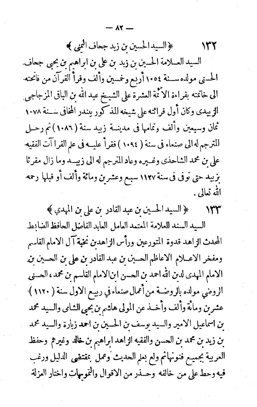 السَّيِّد السَّنَد الْعَلامَة الْمُعْتَمد الْعَامِل العابد الْفَاضِل الْحَافِظ الضَّابِط الْمُحدث الزَّاهِد قدوة المتورعين وَرَأس الزاهدين نخبة آل الإِمَام الْقَاسِم ومفخر الْأَعْلَام الأعاظم الْحُسَيْن بن عبد الْقَادِر بن على بن الْحُسَيْن بن الإِمَام المهدى لدين الله احْمَد بن الْحسن ابْن الإِمَام الْقَاسِم بن مُحَمَّد الْحسنى الروضي مولده بالروضة من أَعمال صنعاء فِي ربيع الأول سنة 1120 عشْرين وَمِائَة وَألف وَأخذ عَن الْمولى هَاشم بن يحيى الشامى وَالسَّيِّد مُحَمَّد بن إِسْمَاعِيل الْأَمِير وَالسَّيِّد يُوسُف بن الْحُسَيْن بن احْمَد زبارة وَالسَّيِّد مُحَمَّد بن زيد بن مُحَمَّد بن الْحسن والفقيه الزَّاهِد إِبْرَاهِيم بن خَالِد وَغَيرهم وَحفظ الْعَرَبيَّة بِجَمِيعِ فنونها ثمَّ ولع بِعلم الحَدِيث وَعمل بِمُقْتَضى الدَّلِيل وَرغب فِيهِ وَحط على من خَالفه وحذر من الْأَقْوَال والتمويهات وَاخْتَارَ الْعُزْلَة