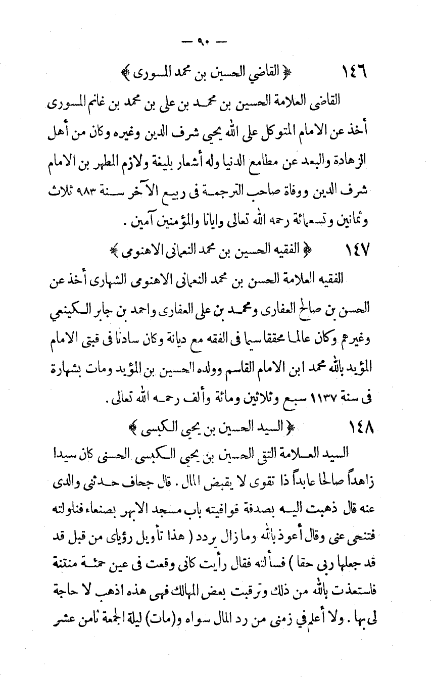 السَّيِّد الْعَلامَة التقى الْحُسَيْن بن يحيى الكبسى الْحسنى كَانَ سيدا زاهدا صَالحا عابدا ذَا تقوى لَا يقبض المَال